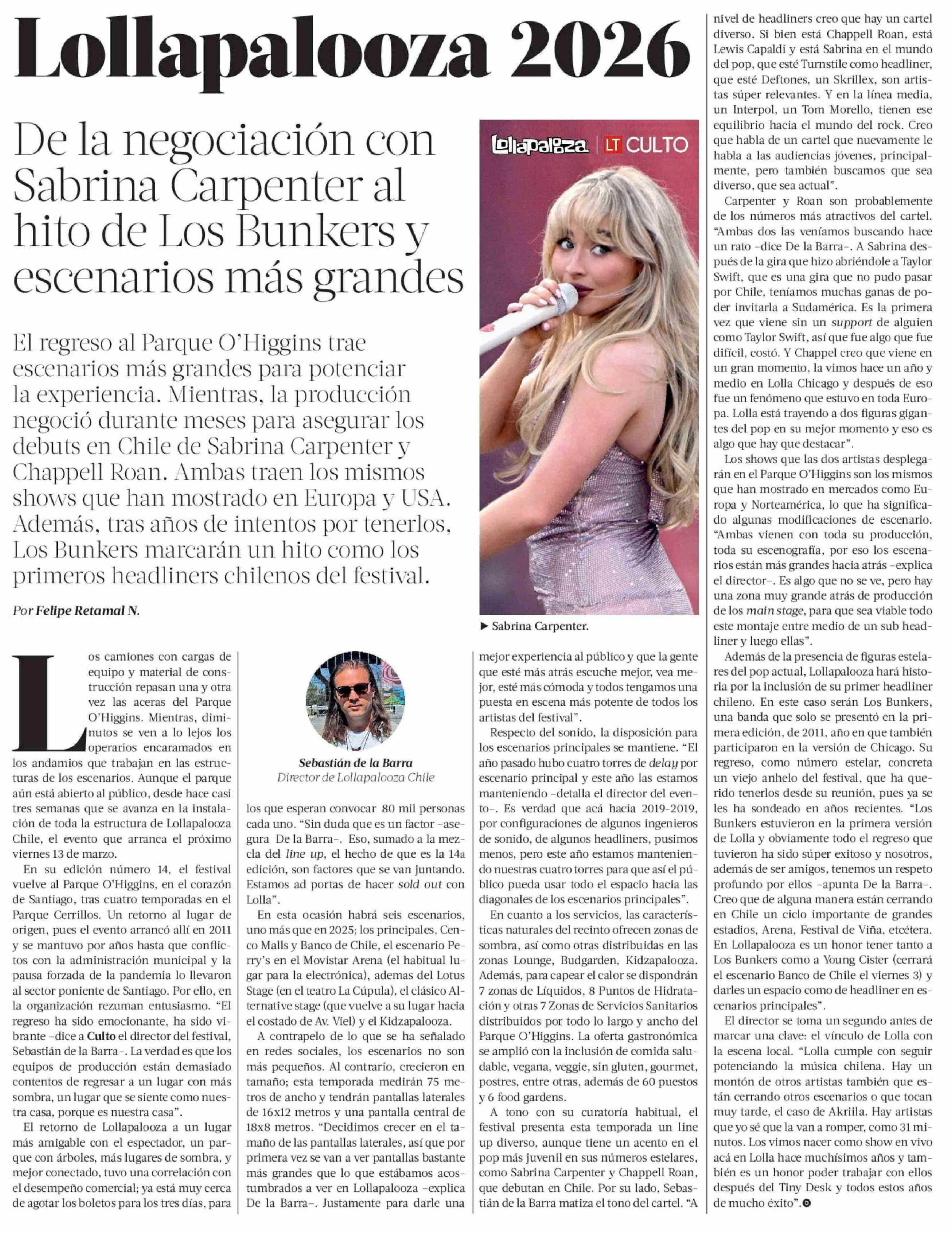 Lollapalooza 2026 De la negociación con Sabrina Carpenter al hito de Los Bunkers y escenarios más grandes