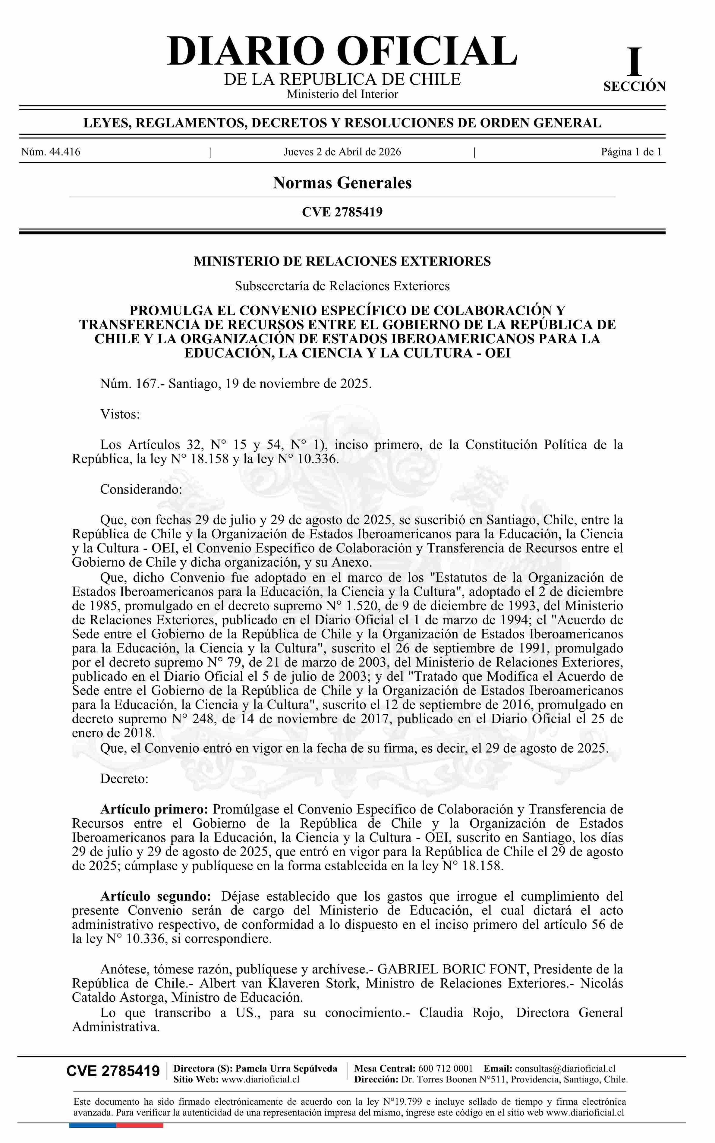 | Título: | PROMULGA EL CONVENIO ESPECÍFICO DE COLABORACIÓN Y TRANSFERENCIA DE RECURSOS ENTRE EL GOBIERNO DE LA REPUBLICA DE CHILE Y LA ORGANIZACIÓN DE ESTADOS IBEROAMERICANOS PARA LA EDUCACION, LA CIENCIA Y LA CULTURA - OEI |