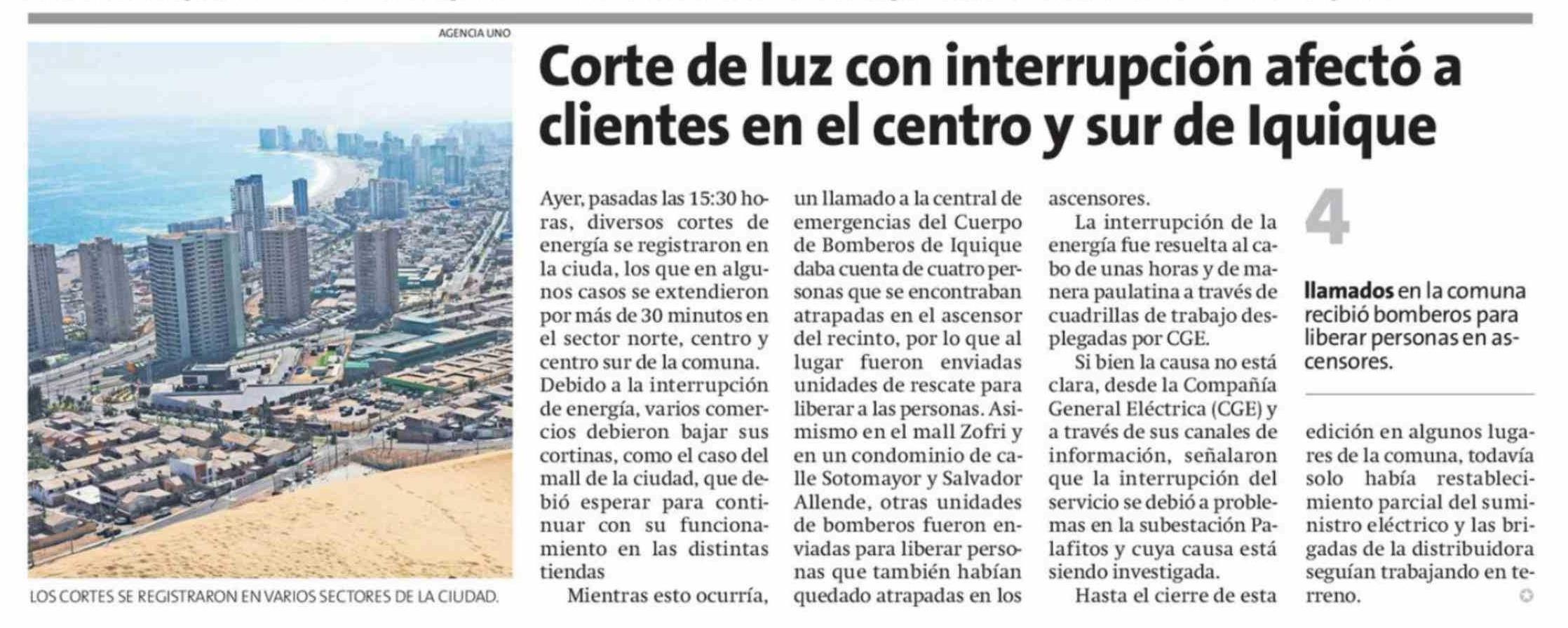 Corte de luz con interrupción afectó a clientes en el centro y sur de Iquique