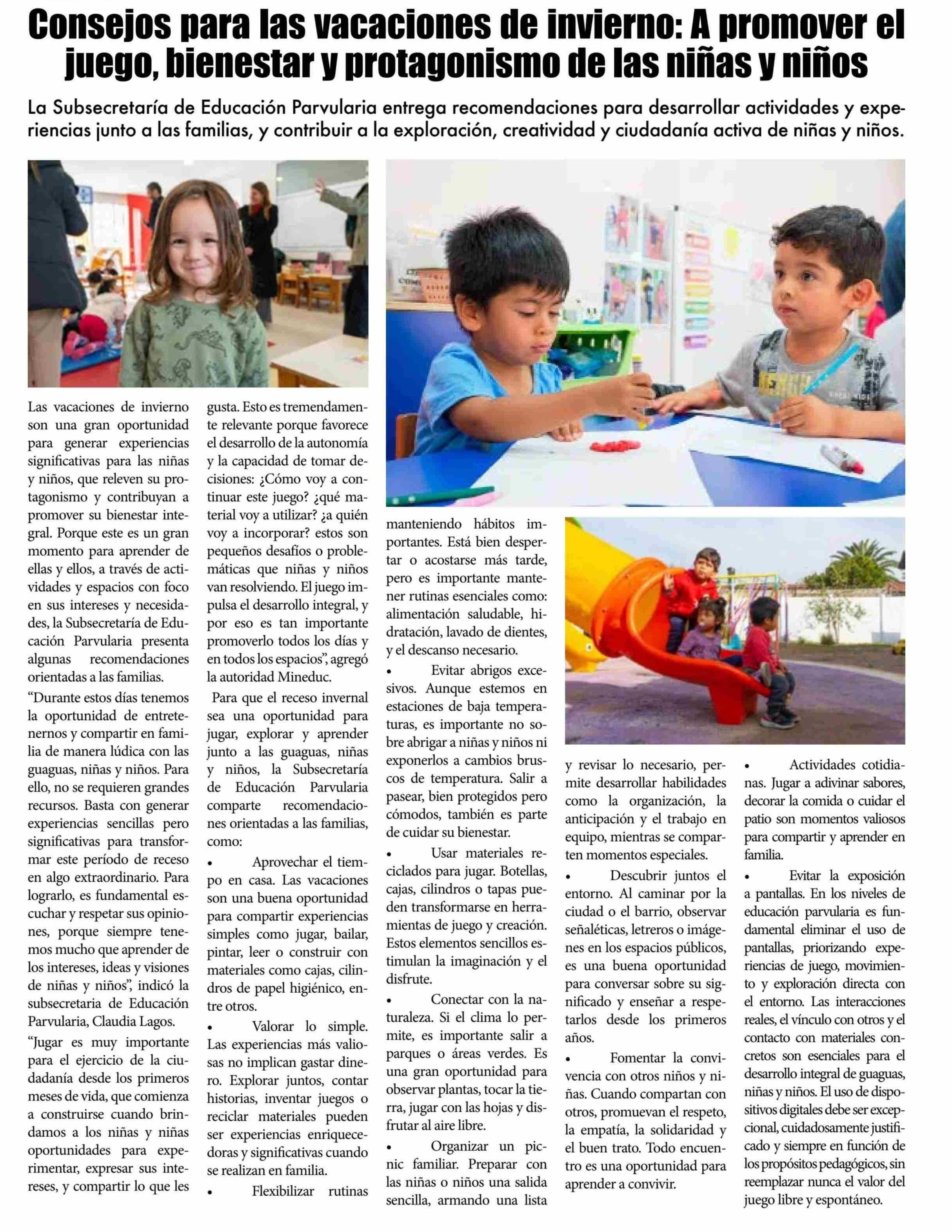 Consejos para las vacaciones de invierno: A promover el juego, bienestar y protagonismo de las niñas y niños