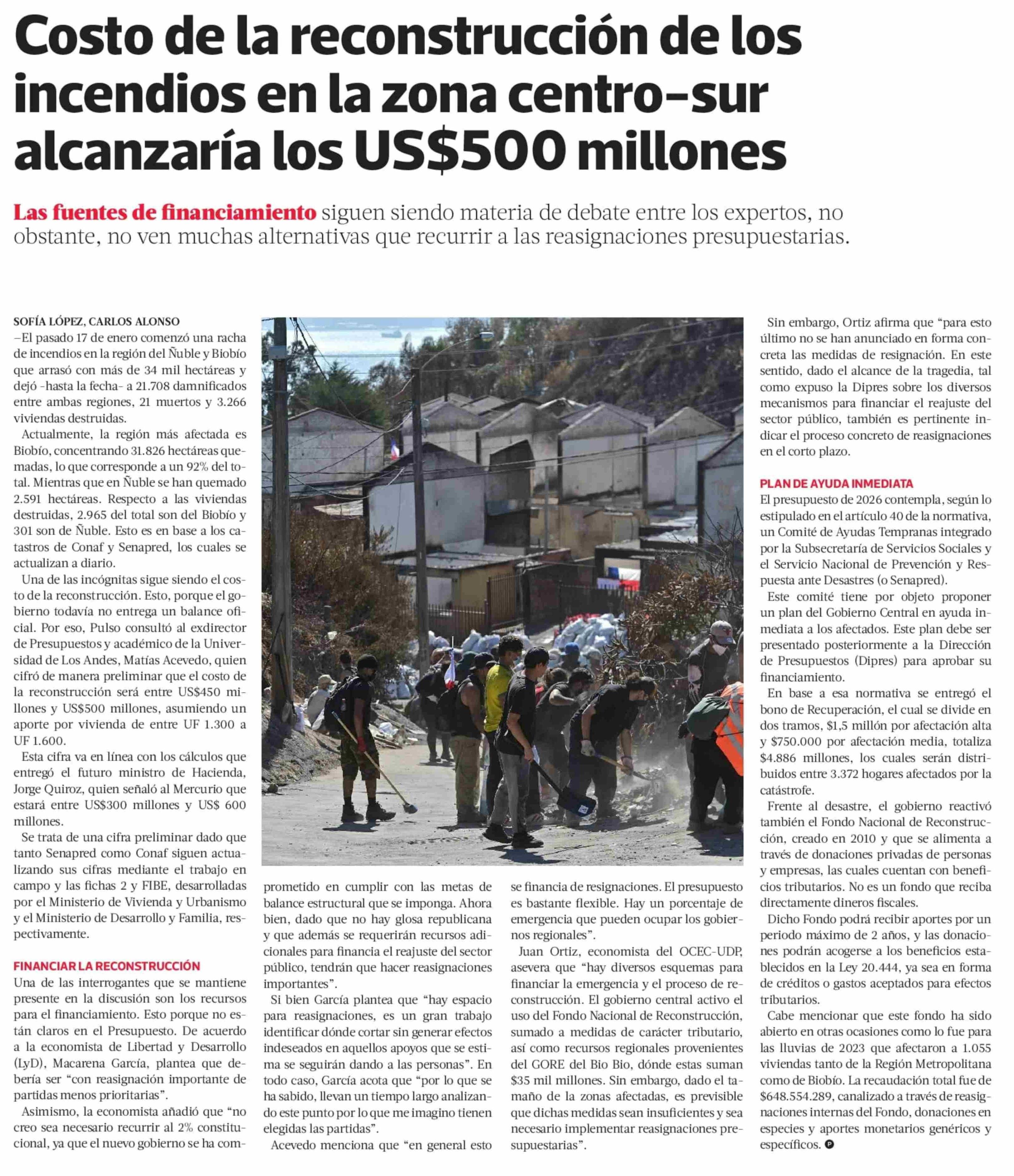 Costo de la reconstrucción de los incendios en la zona centro-sur alcanzaría los US$500 millones