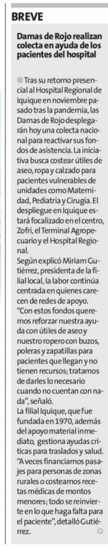 Título: BREVE Damas de Rojo realizan colecta en ayuda de los pacientes del hospital · Tras su retorno presencial al Hospital Regional de Iquique en noviembre pasado tras la pandemia, las Damas de Rojo desplegarán hoy una colecta nacional para reactivar sus fondos de asistencia. La iniciativa busca costear ú