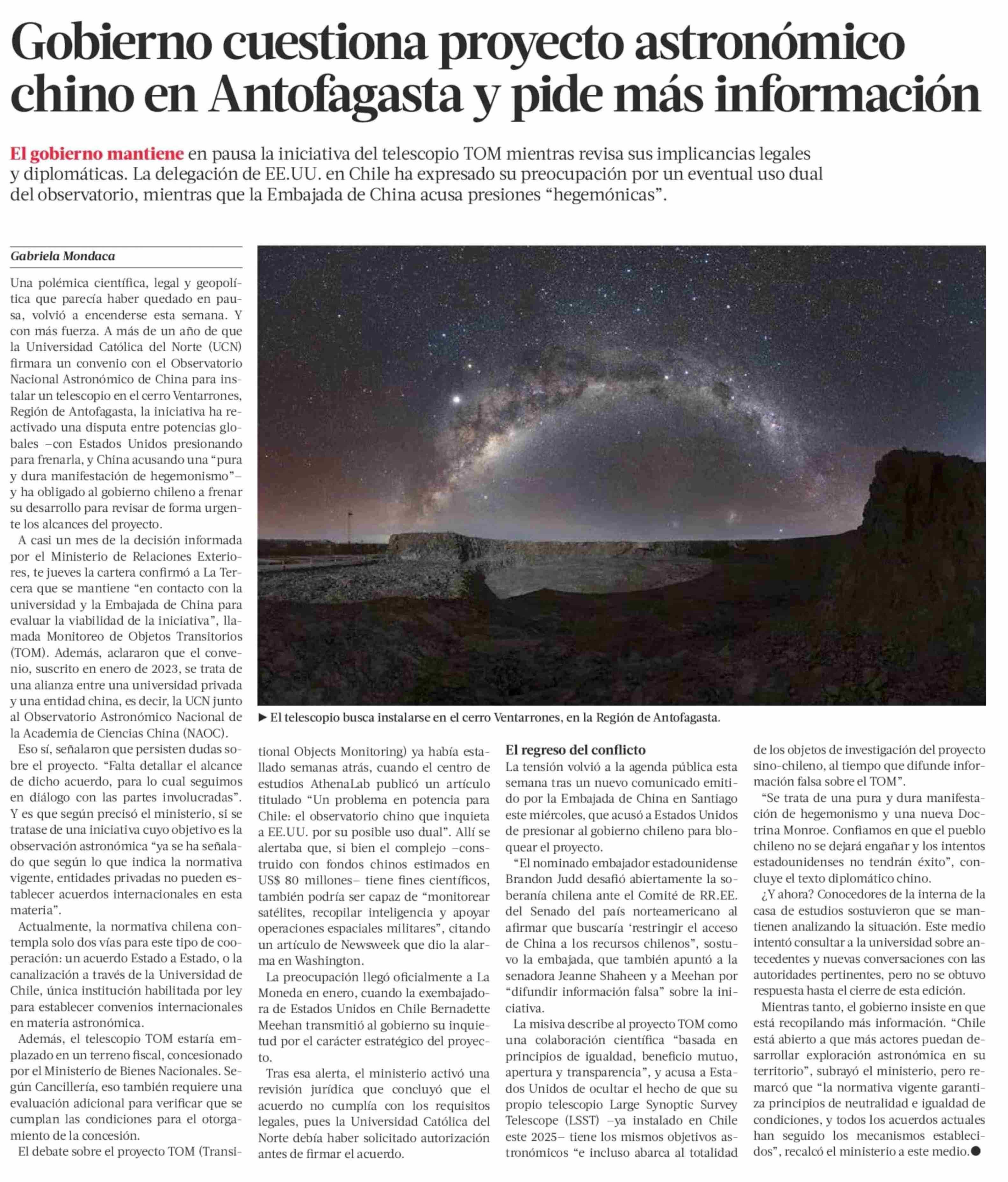 Gobierno cuestiona proyecto astronómico chino en Antofagasta y pide más información