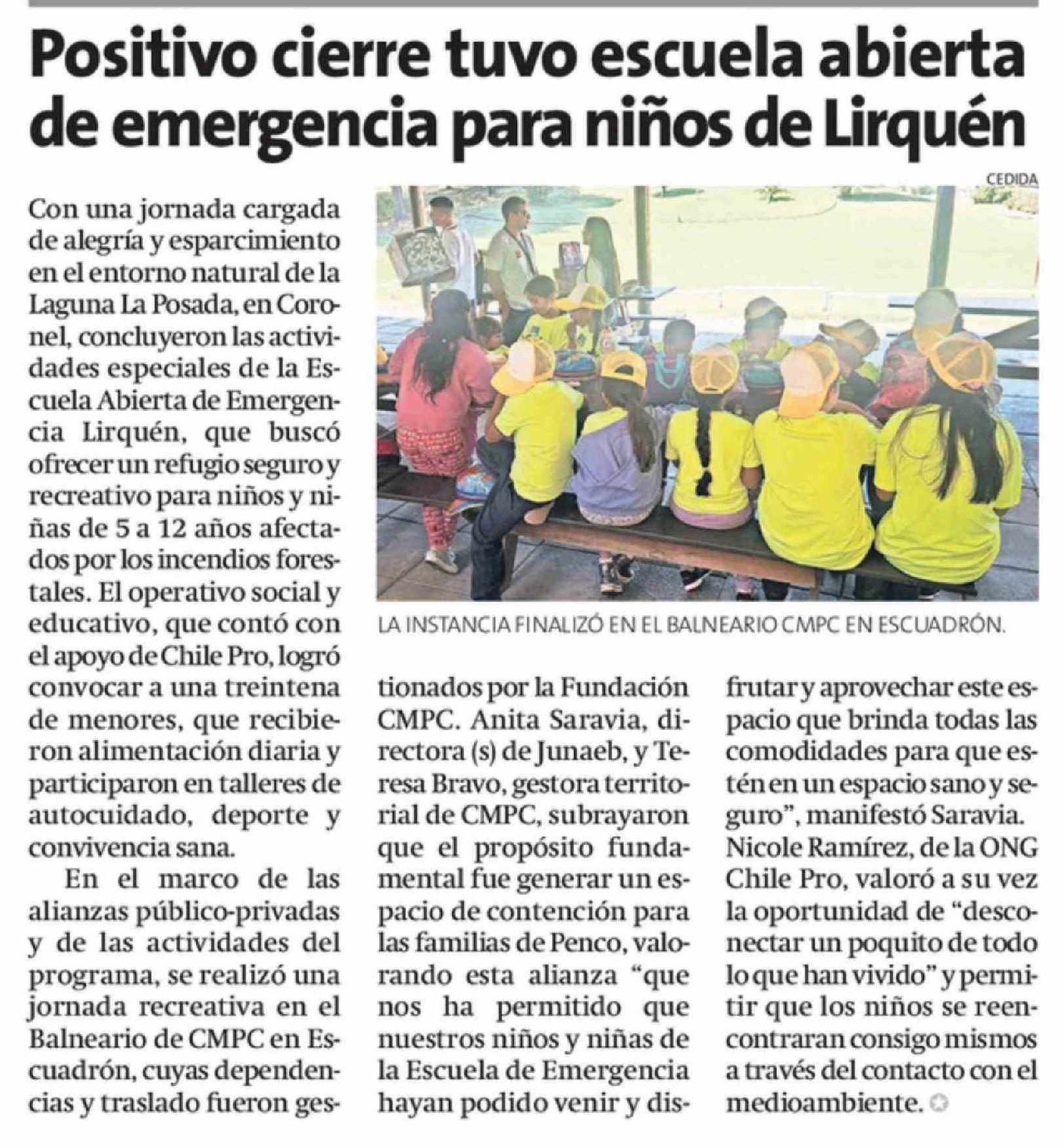 Positivo cierre tuvo escuela abierta de emergencia para niños de Lirquén