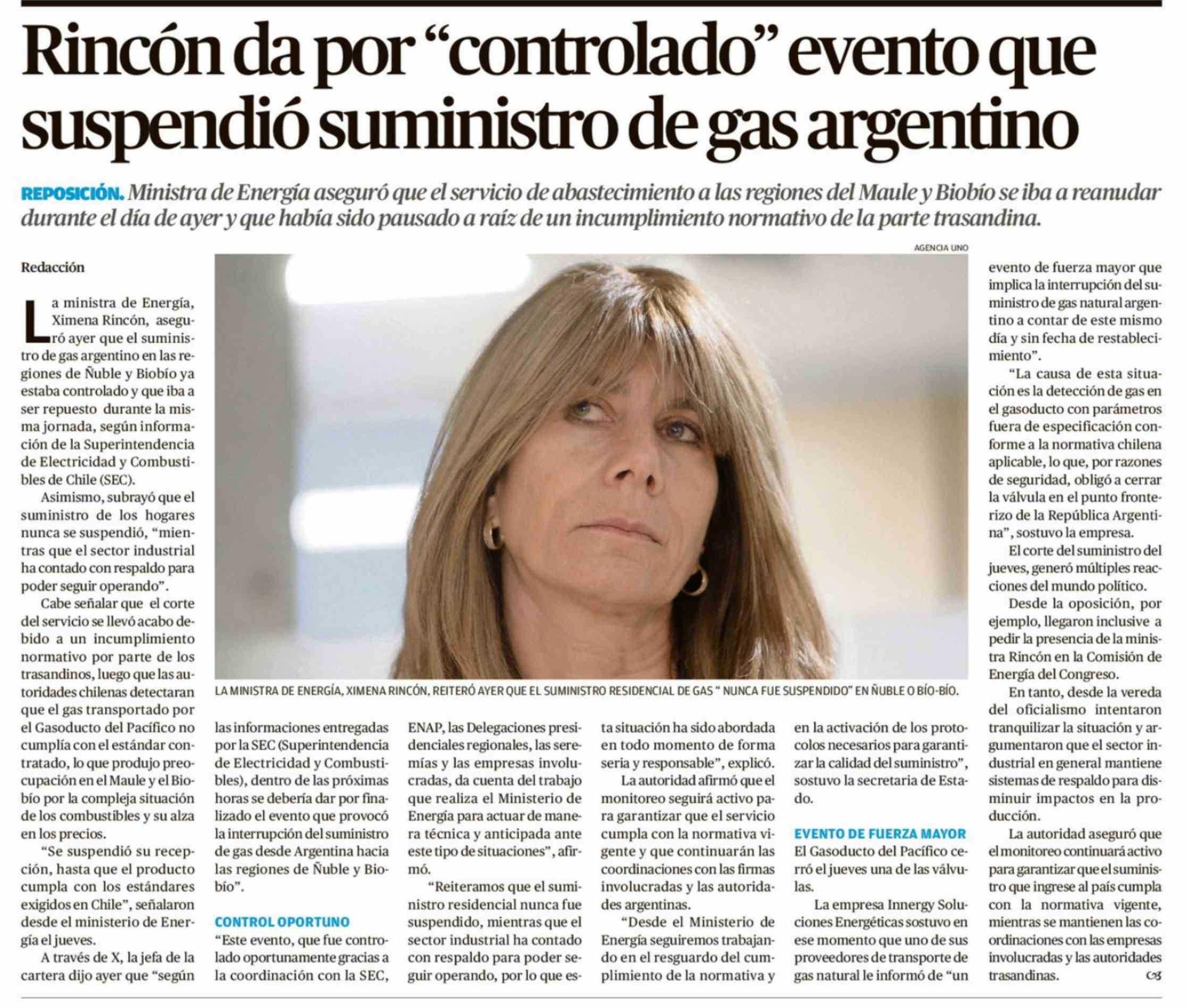 Rincón da por "controlado" evento que suspendió suministro de gas argentino