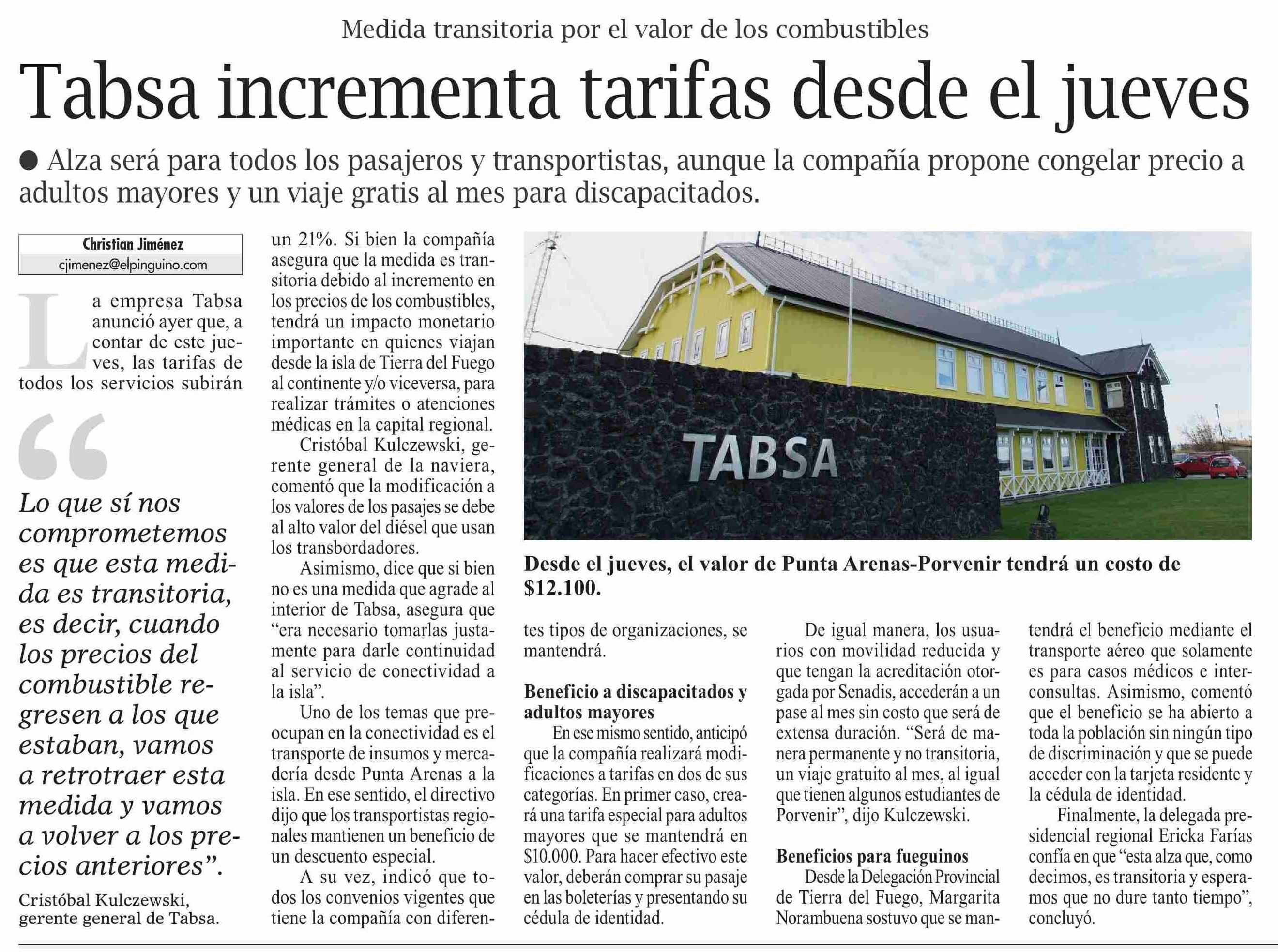 Tabsa incrementa tarifas desde el jueves