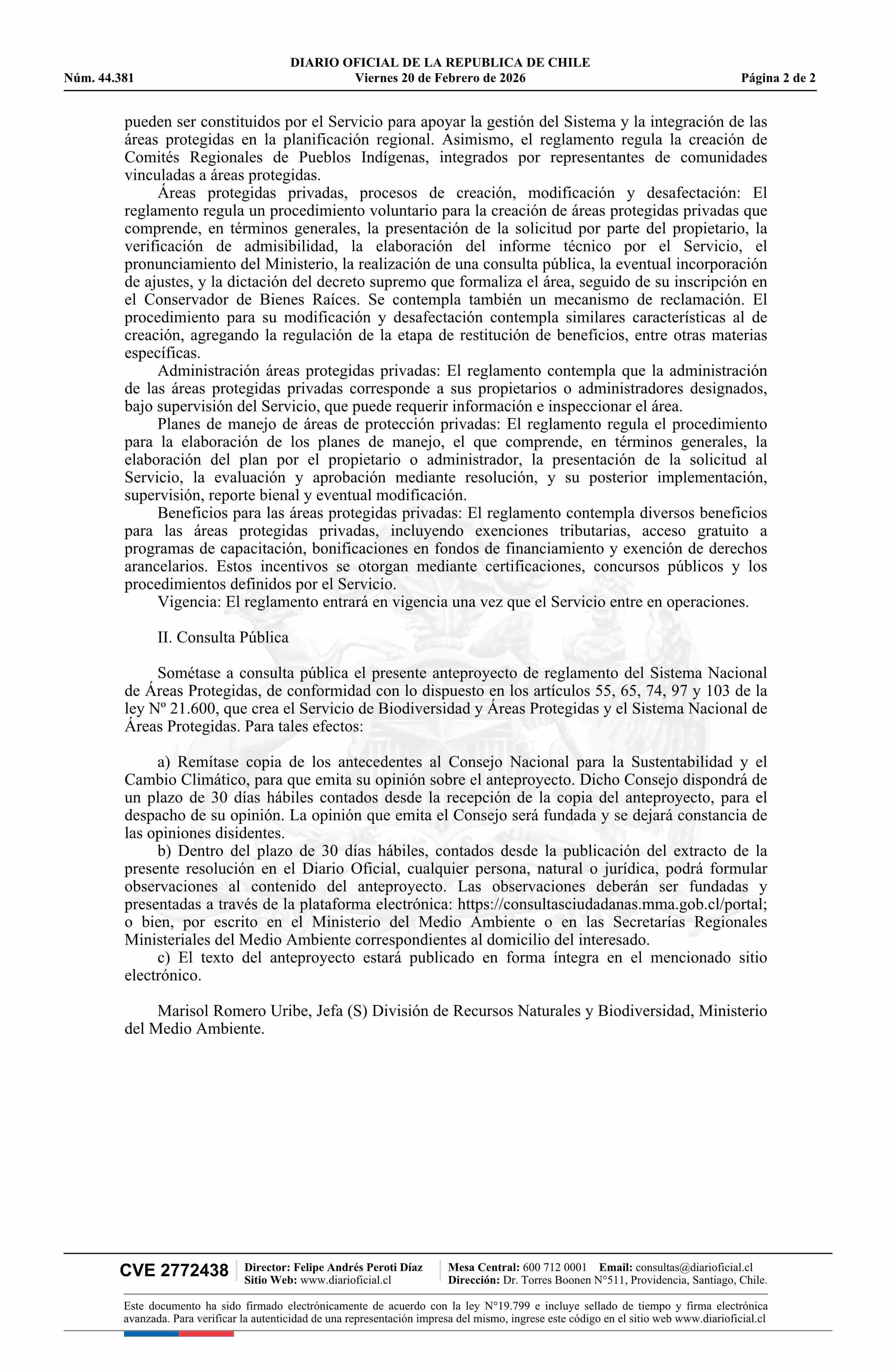 Título: Extracto de resolución exenta número 730, de 2026.- Aprueba anteproyecto de reglamento del Sistema Nacional de Áreas Protegidas, de conformidad con lo dispuesto en los artículos 55, 65, 74, 97 y 103 de la ley Nº 21.600, que crea el Servicio de Biodiversidad y Áreas Protegidas y el Sistema Nacional d