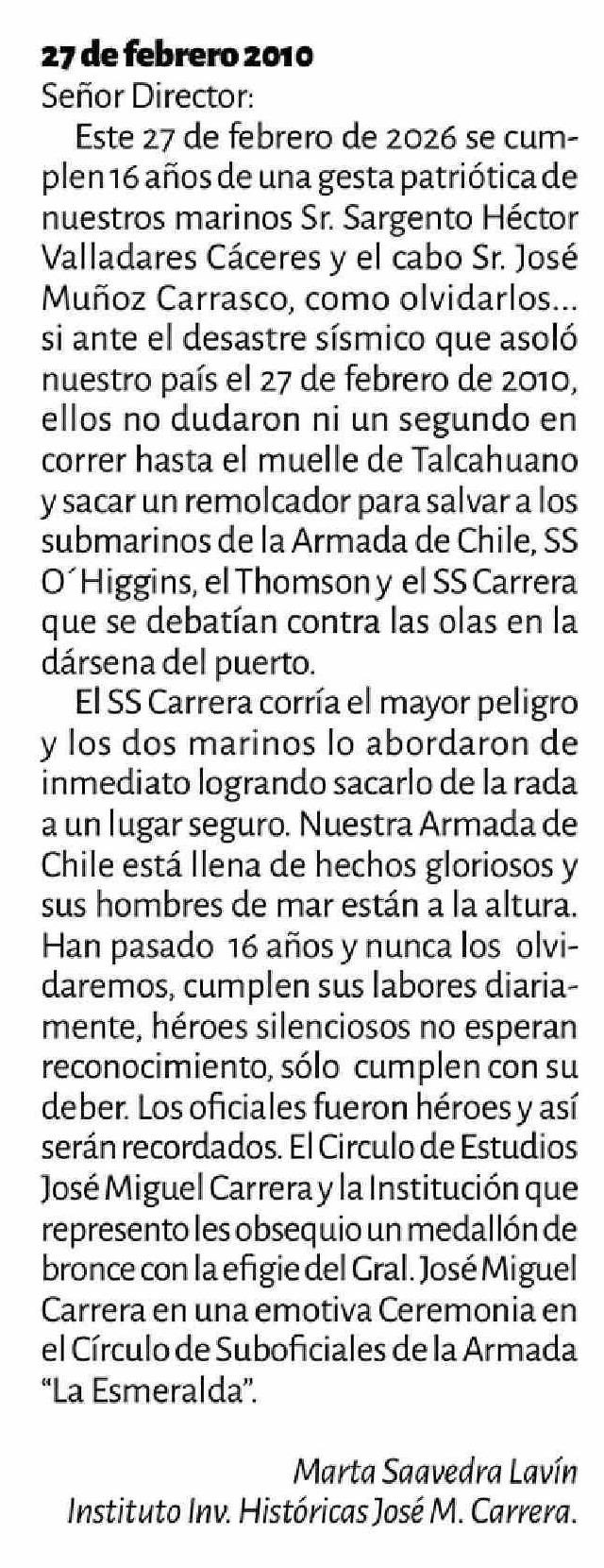 | Título: | Cartas: 27 de febrero 2010 Señor Director: Este 27 de febrero de 2026 se cumplen 16 años de una gesta patriótica de nuestros marinos Sr. Sargento Hector Valladares Cáceres y el cabo Sr. José Muñoz Carrasco, como olvidarlos ... si ante el desastre sísmico que asoló nuestro país el 27 de febrero de 20 |