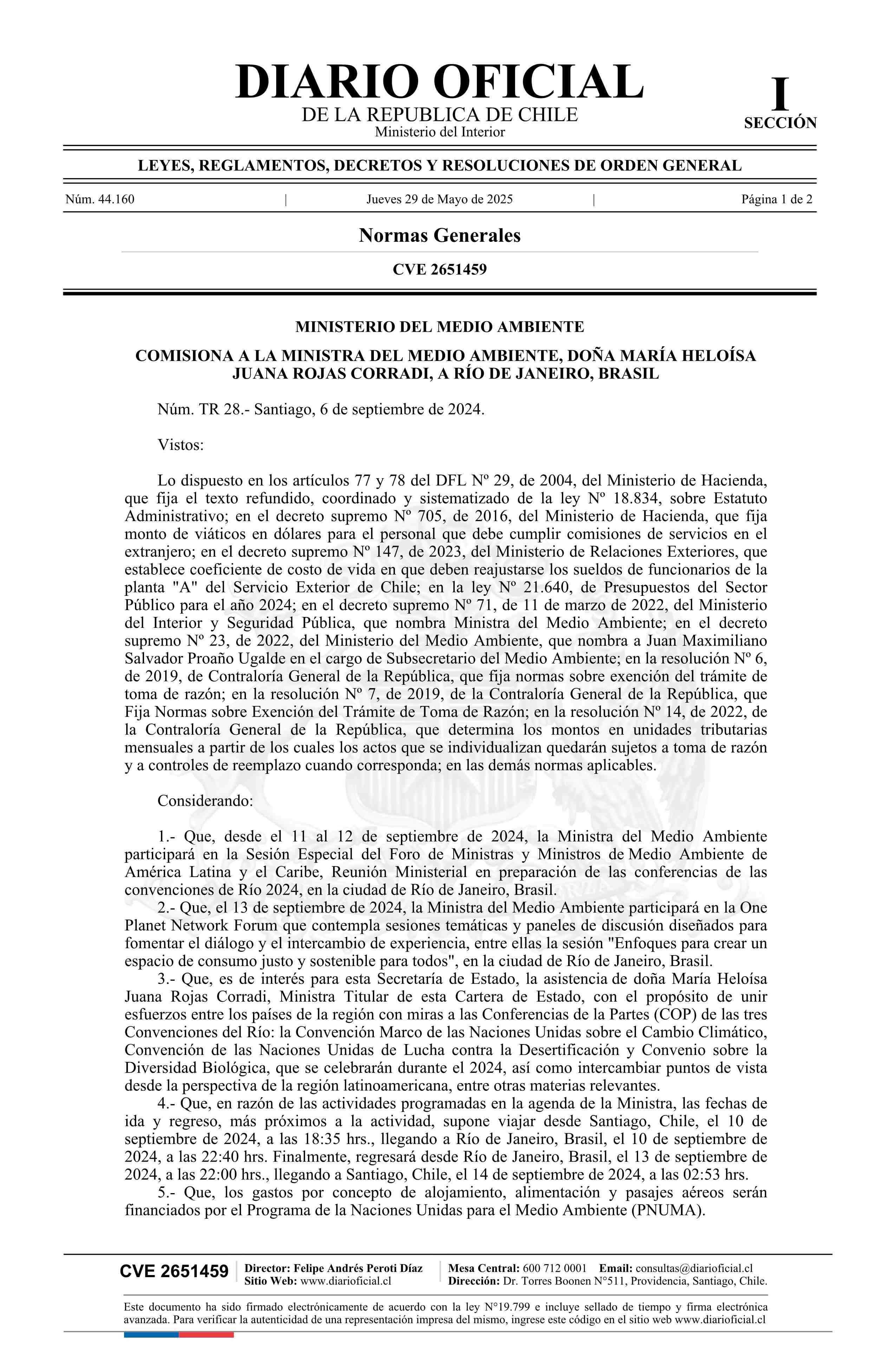| Título: | Decreto número TR 28, de 2024.- Comisiona a la Ministra del Medio Ambiente, doña María Heloísa Juana Rojas Corradi, a Río de Janeiro, Brasil |