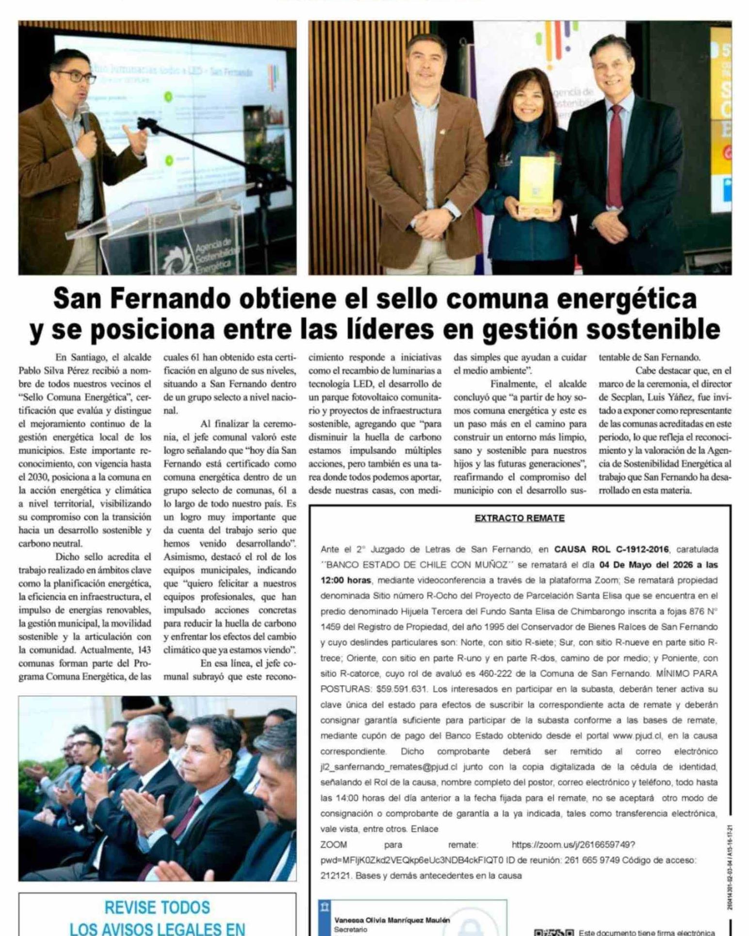 San Fernando obtiene el sello comuna energética y se posiciona entre las líderes en gestión sostenible