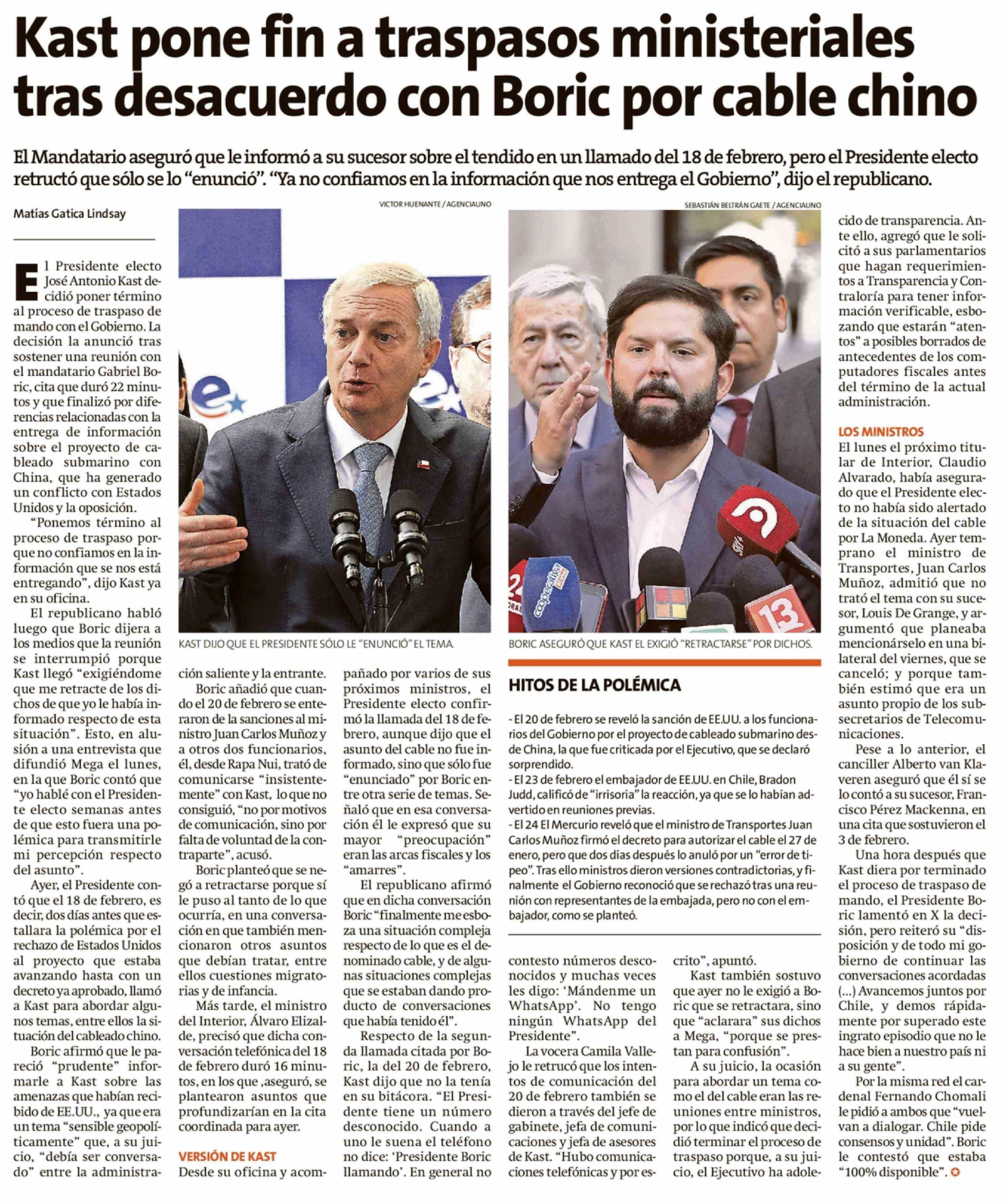 Kast pone fin a traspasos ministeriales tras desacuerdo con Boric por cable chino