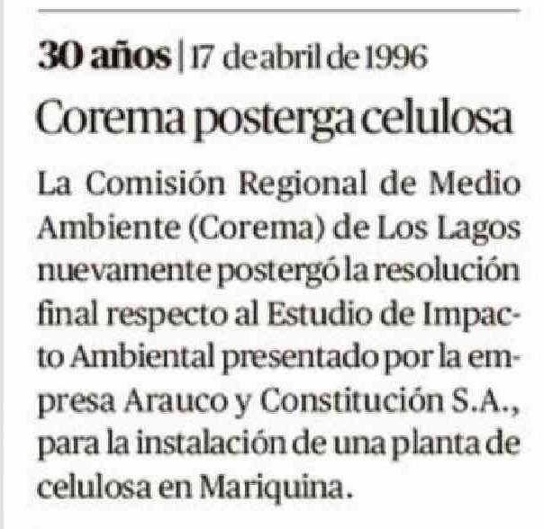 Título: 30 años | 17 deabril de 1996 Corema posterga celulosa La Comisión Regional de Medio Ambiente (Corema) de Los Lagos nuevamente postergó la resolución final respecto al Estudio de Impacto Ambiental presentado por la empresa Arauco y Constitución S.A., para la instalación de una planta de celulosa en M