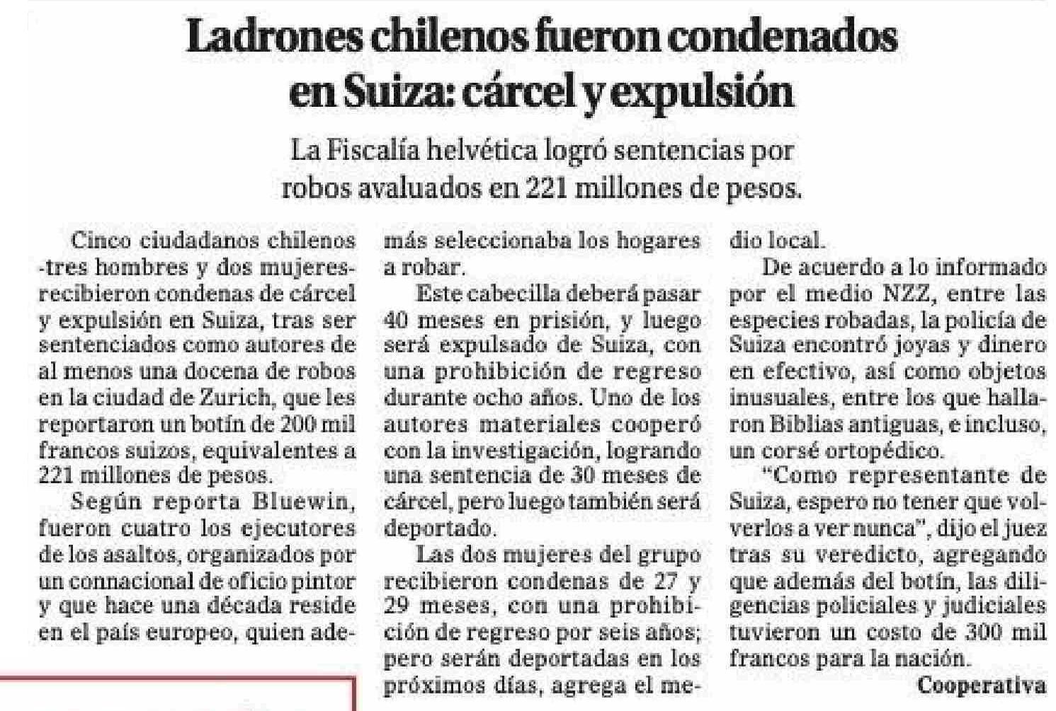 Ladrones chilenos fueron condenados en Suiza: cárcel y expulsión