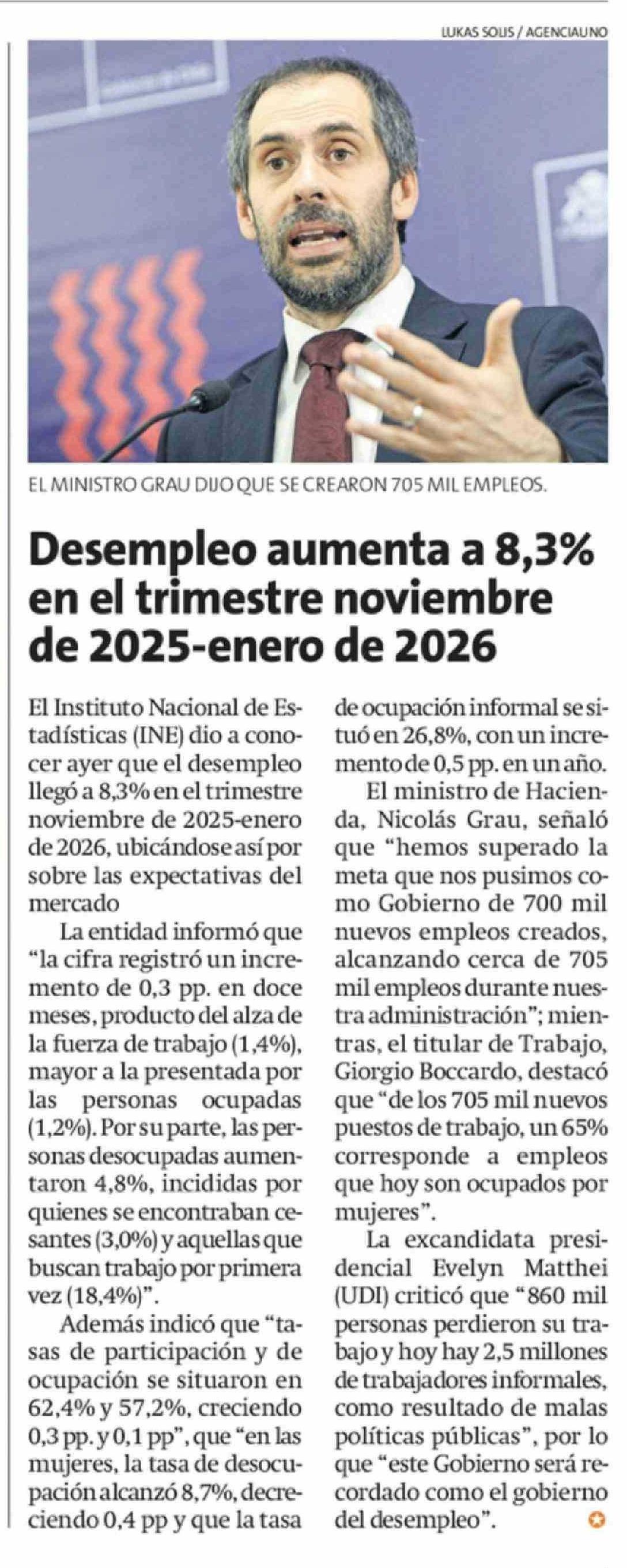 Desempleo aumenta a 8,3% en el trimestre noviembre de 2025-enero de 2026