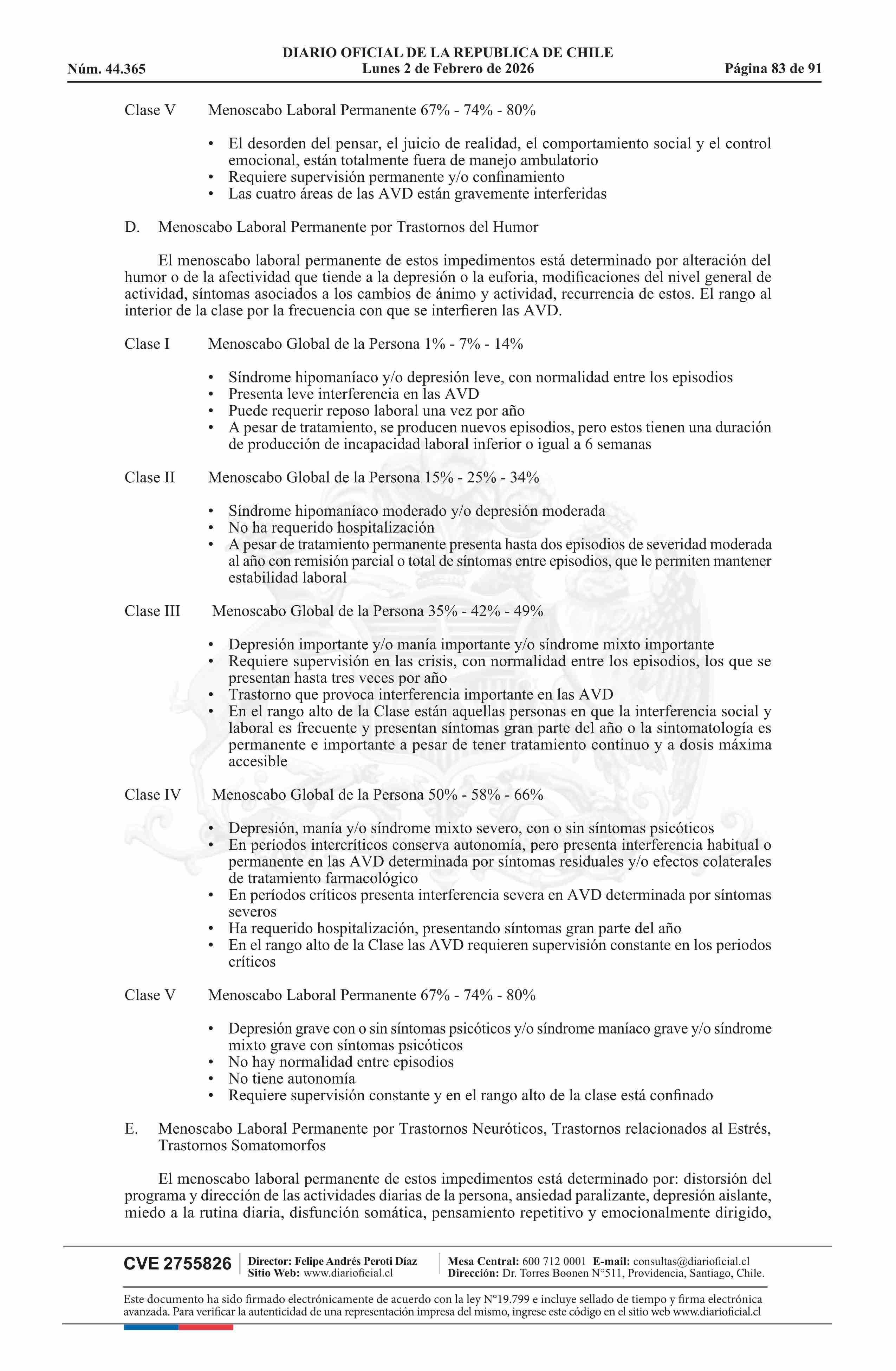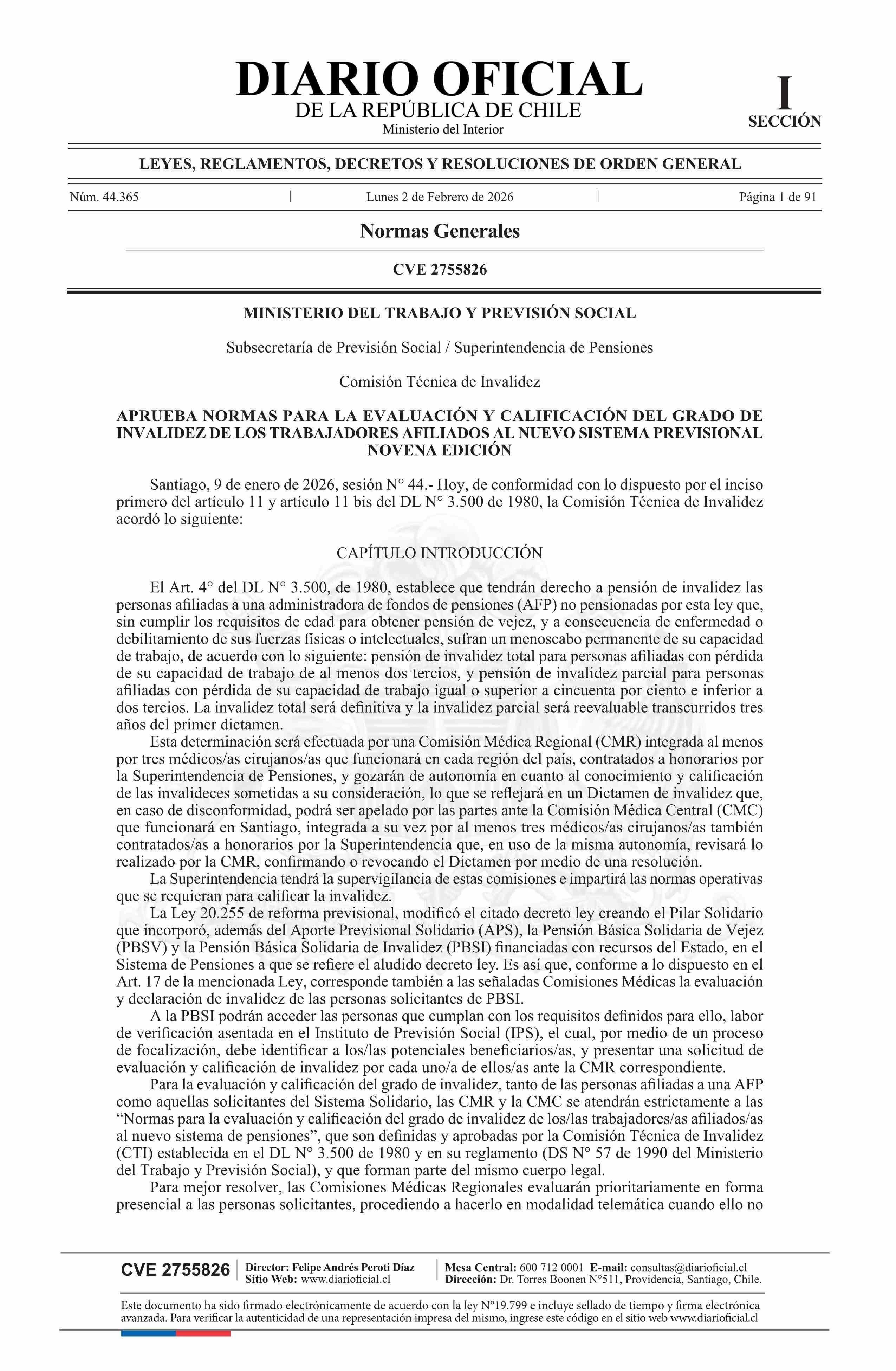 | Título: | Acuerdo Aprueba Normas para la Evaluación y Calificación del Grado de Invalidez de los Trabajadores Afiliados al Nuevo Sistema Previsional Novena Edición |