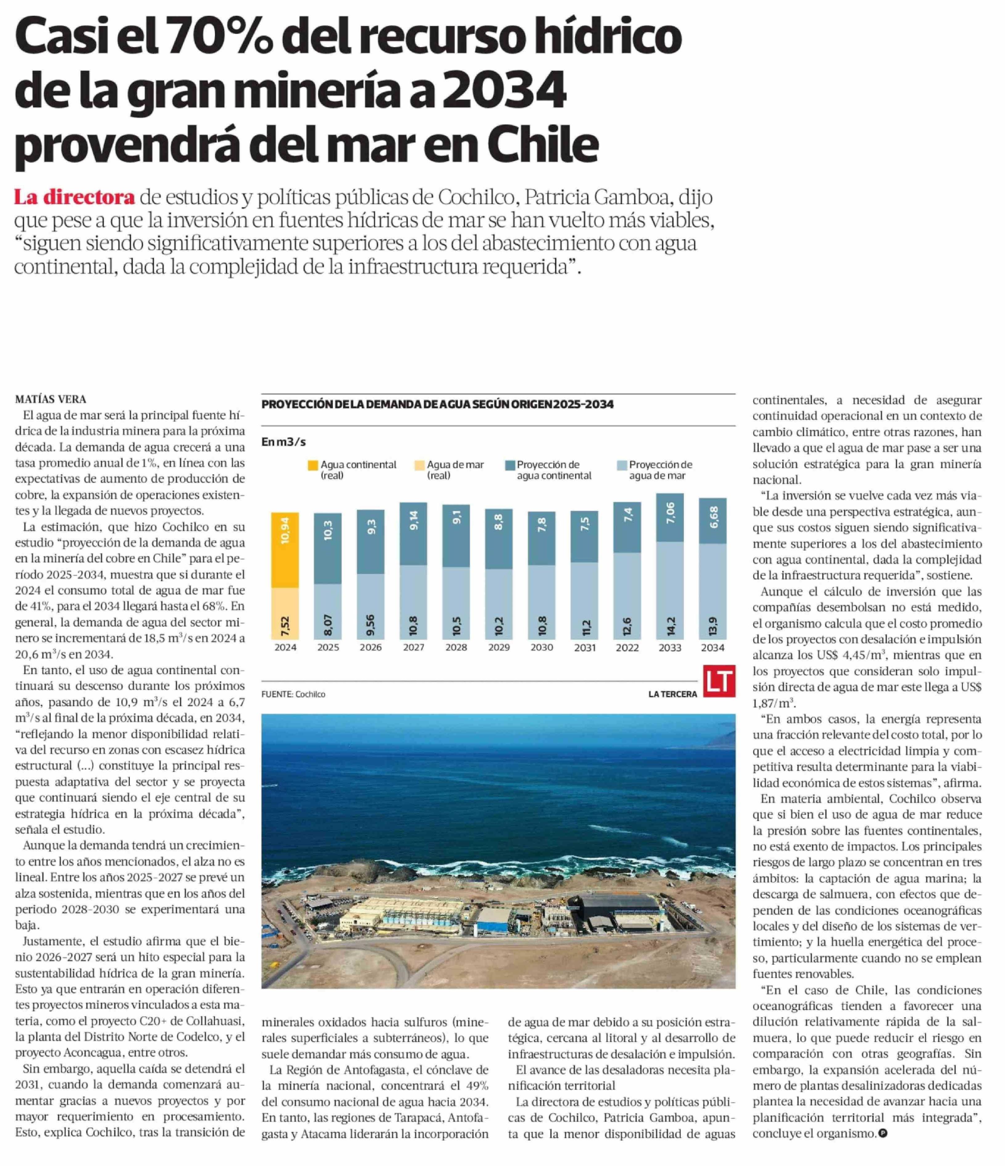 Casi el 70% del recurso hídrico de la gran minería a 2034 provendrá del mar en Chile