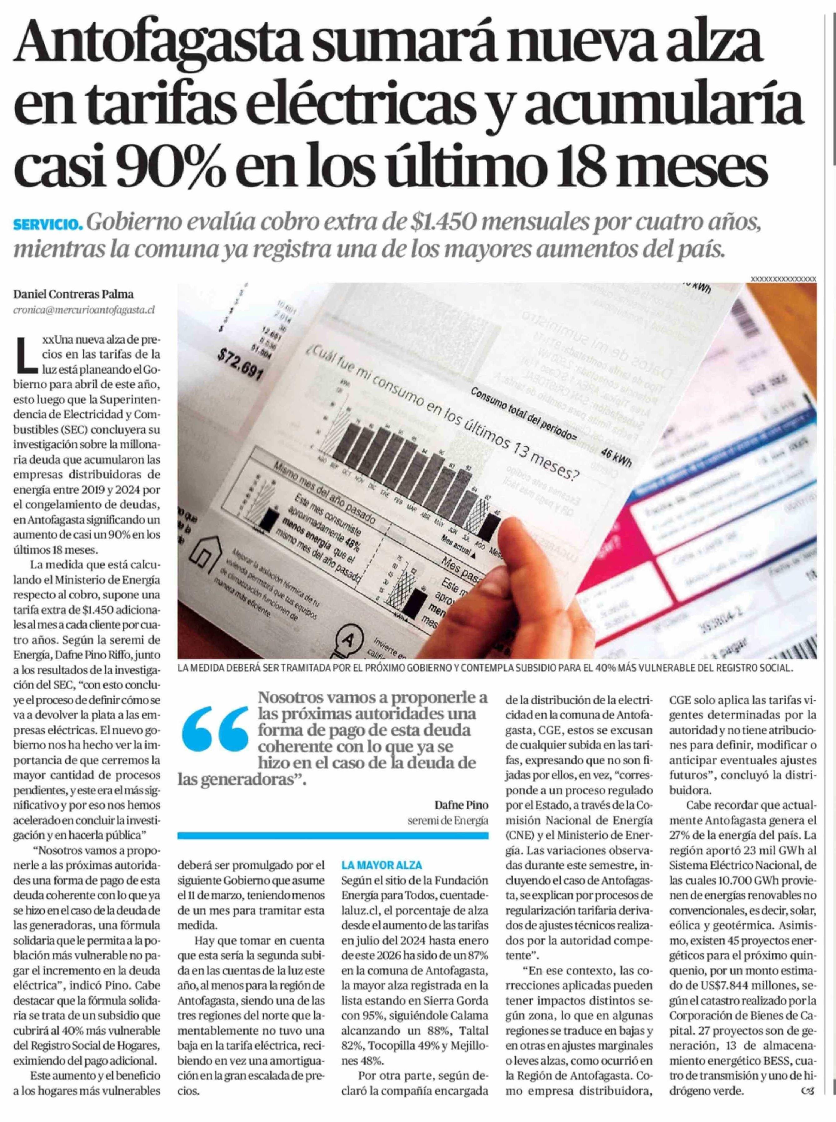 Antofagasta sumará nueva alza en tarifas eléctricas y acumularía casi 90% en los último 18 meses