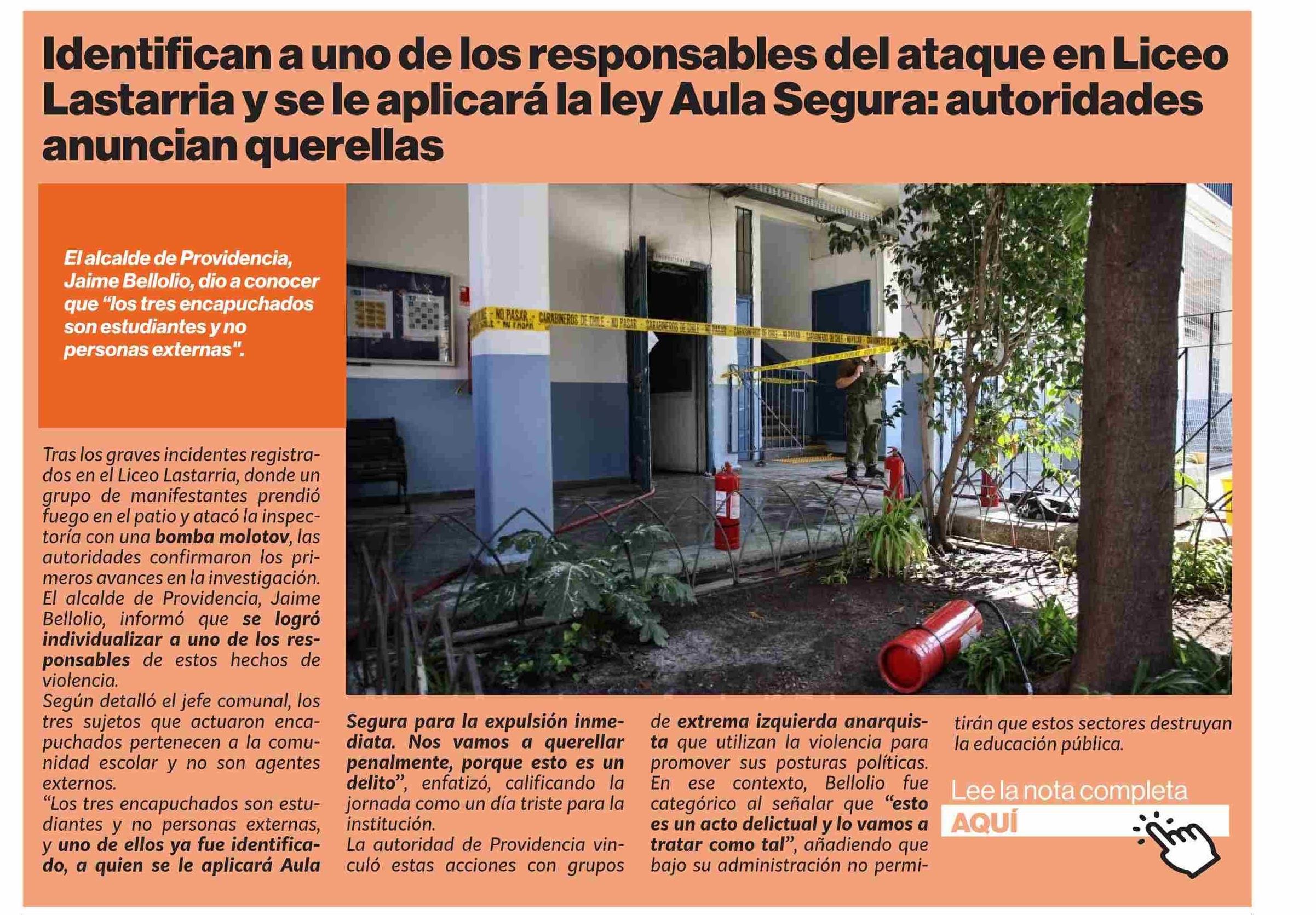 Identifican a uno de los responsables del ataque en Liceo Lastarria y se le aplicará la ley Aula Segura: autoridades anuncian querellas