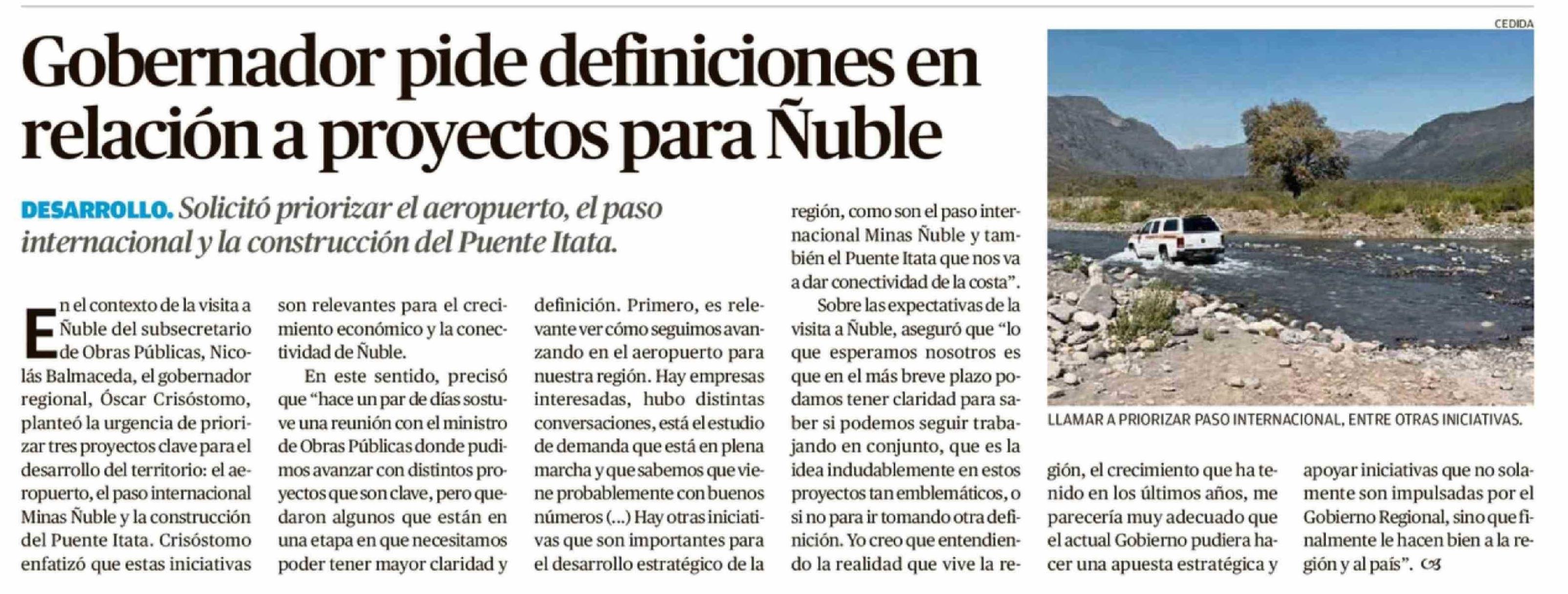 Gobernador pide definiciones en relación a proyectos para Nuble