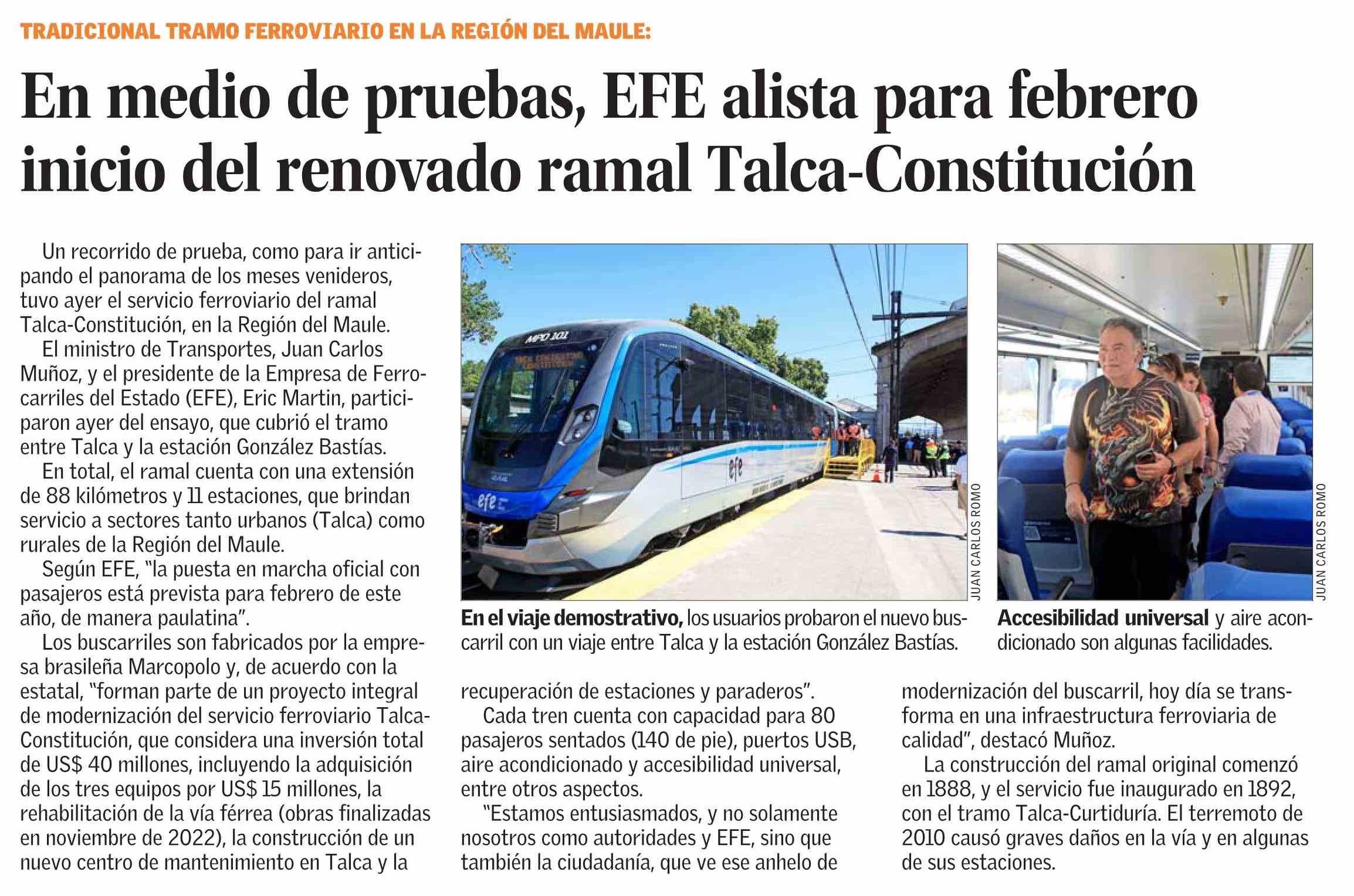 En medio de pruebas, EFE alista para febrero inicio del renovado ramal Talca-Constitución