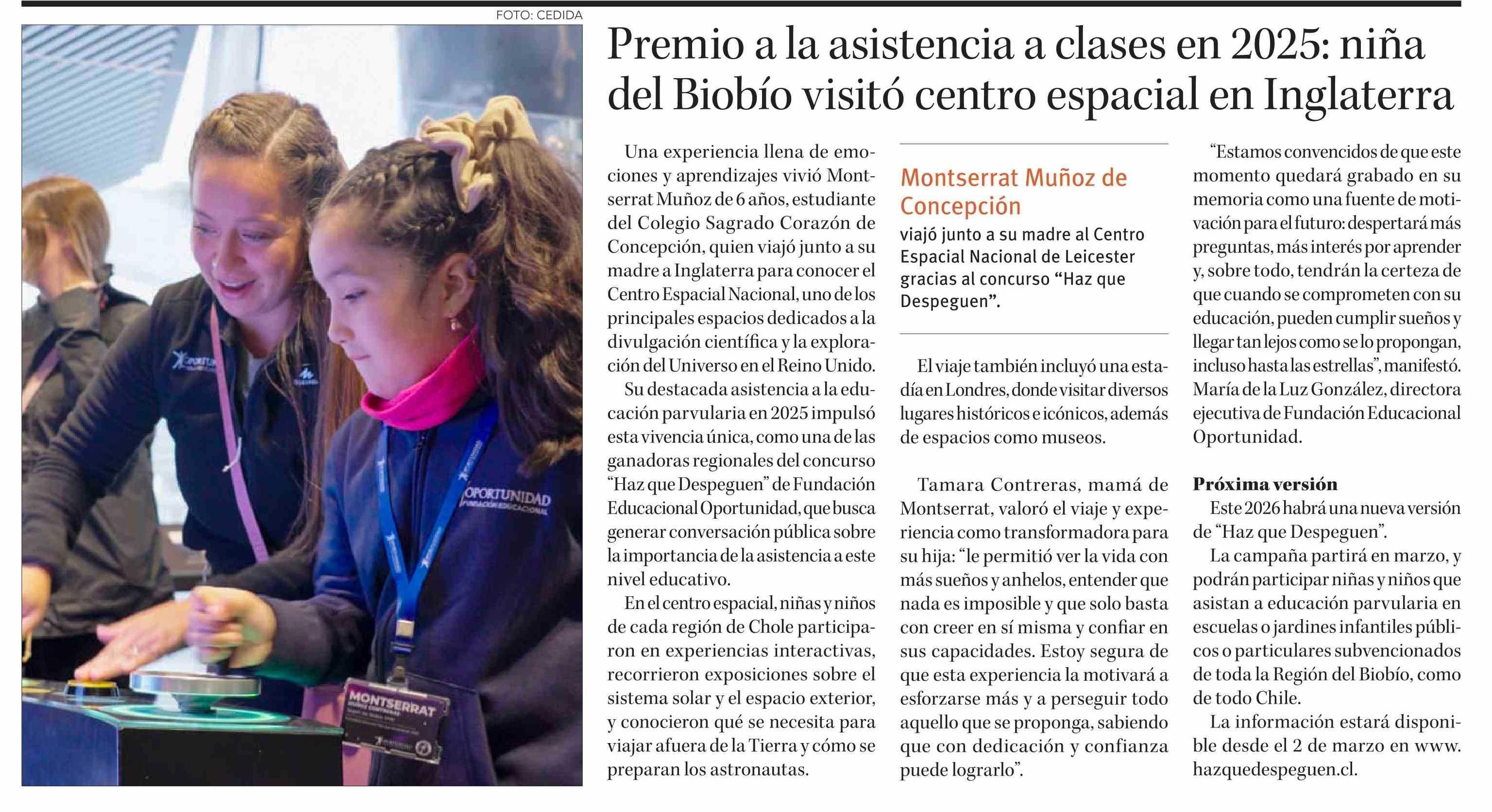 Premio a la asistencia a clases en 2025: niña del Biobío visitó centro espacial en Inglaterra
