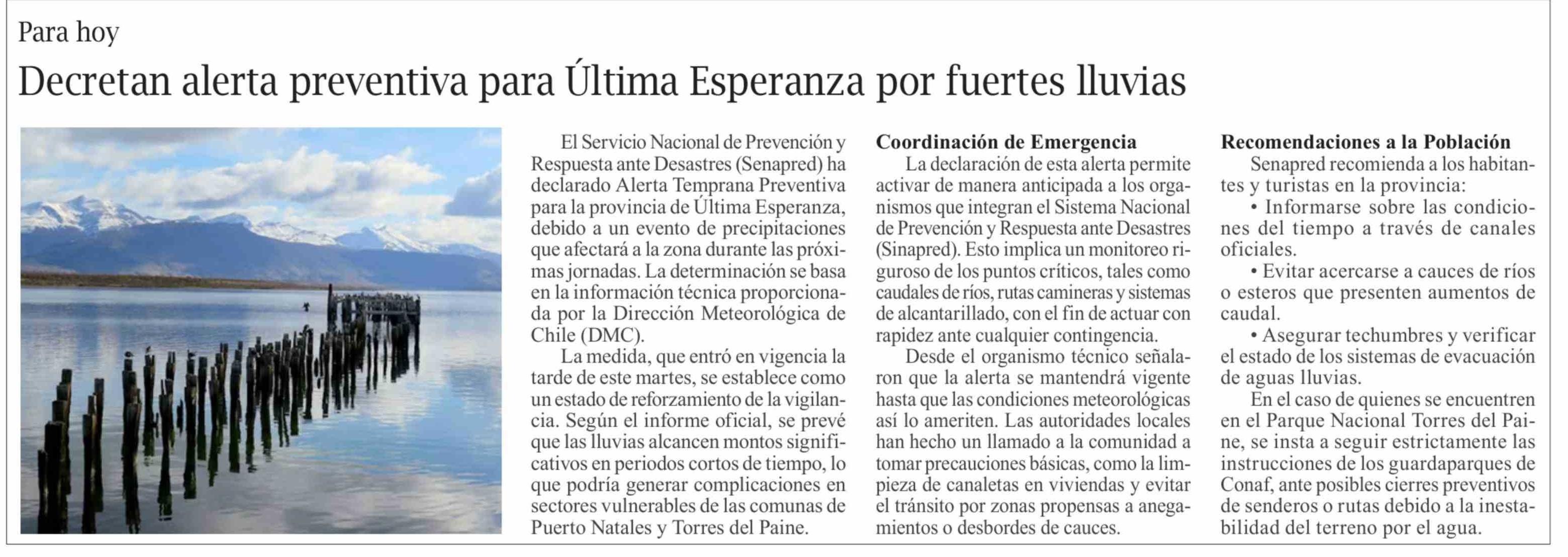Decretan alerta preventiva para Última Esperanza por fuertes lluvias
