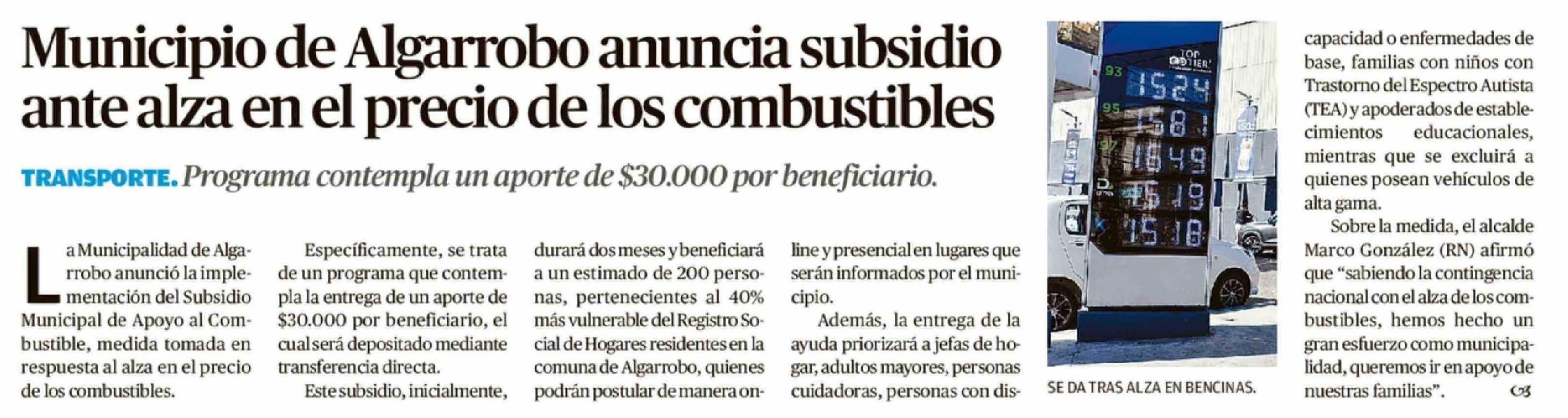 Municipio de Algarrobo anuncia subsidio ante alza en el precio de los combustibles