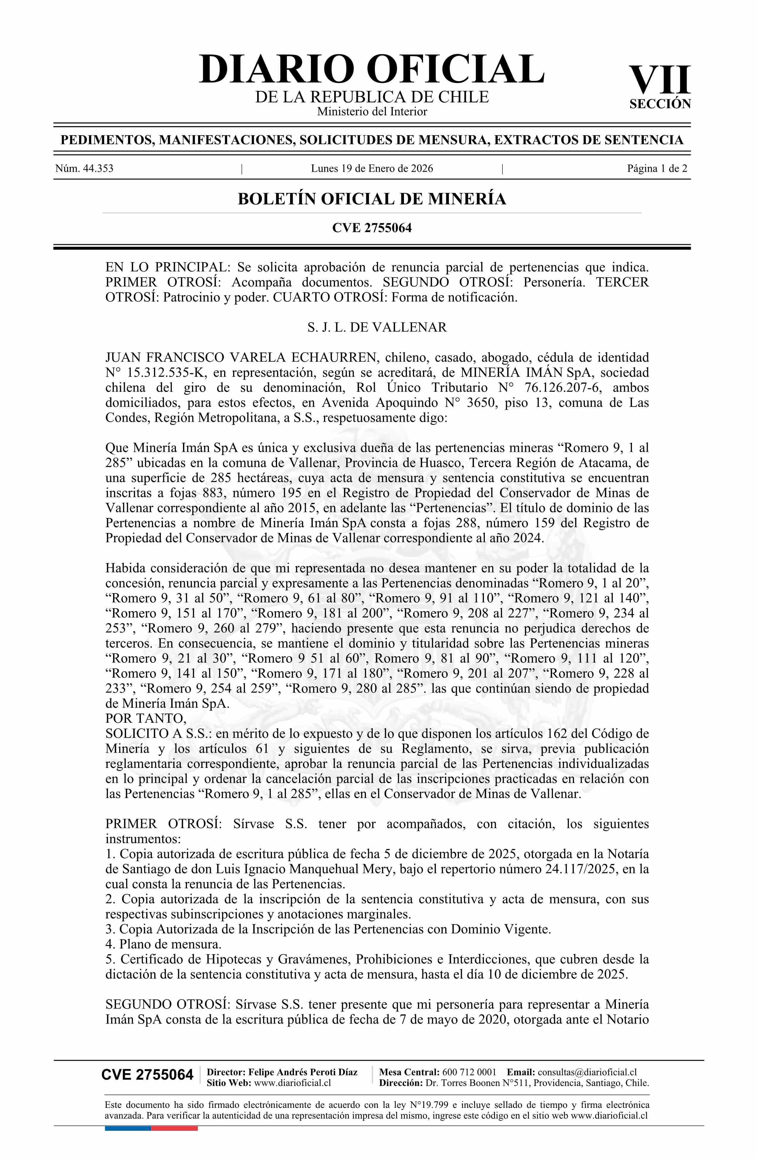 DIARIO OFICIAL CHILE - BOLETÍN OFICIAL DE MINERÍA (DIARIO OFICIAL CHILE – BOM – RENUNCIAS CONCESIÓN)