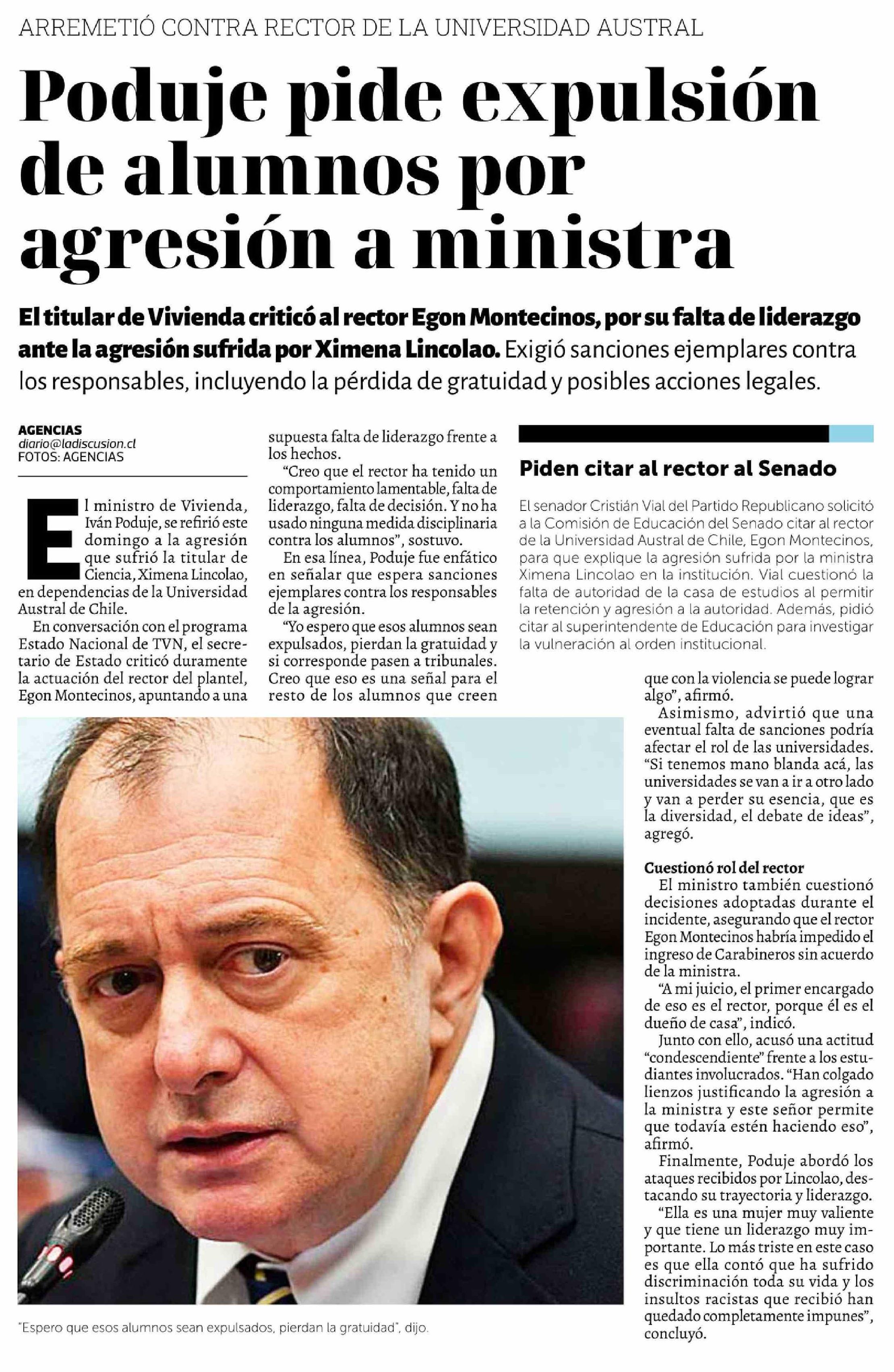 Título: Poduje pide expulsión de alumnos por agresión a ministra