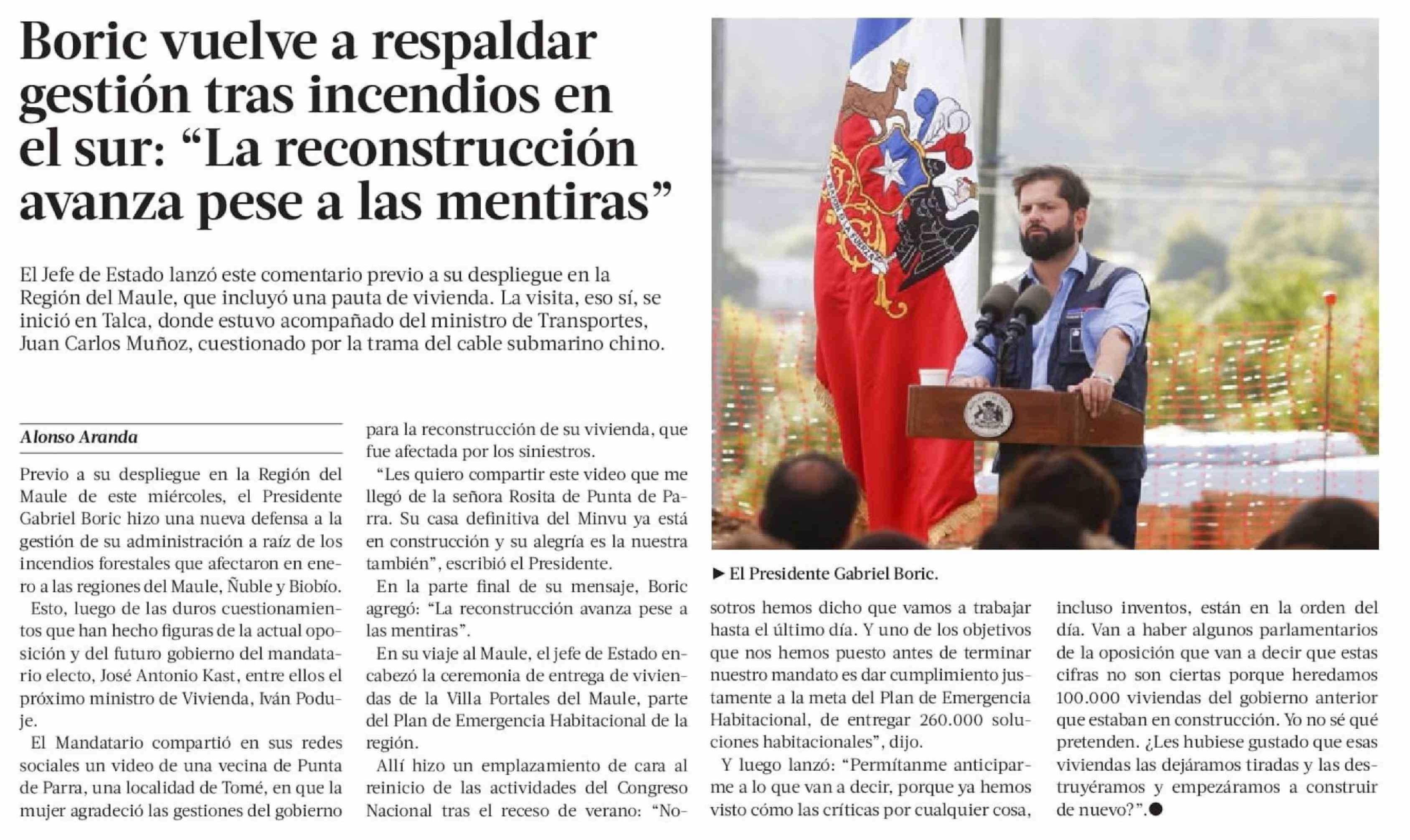 Boric vuelve a respaldar gestión tras incendios en el sur: "La reconstrucción avanza pese a las mentiras"