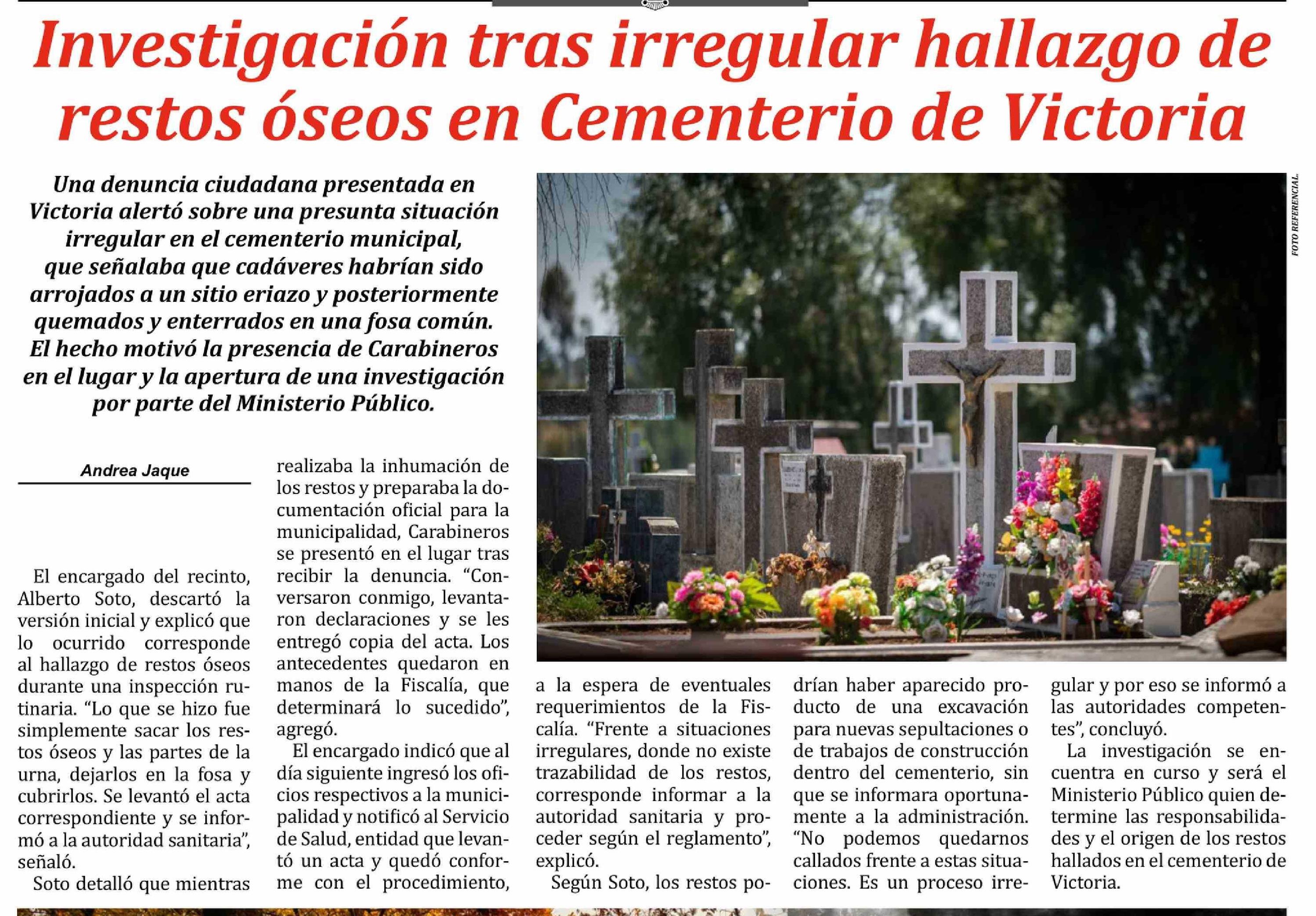 Título: Investigación tras irregular hallazgo de restos óseos en Cementerio de Victoria
