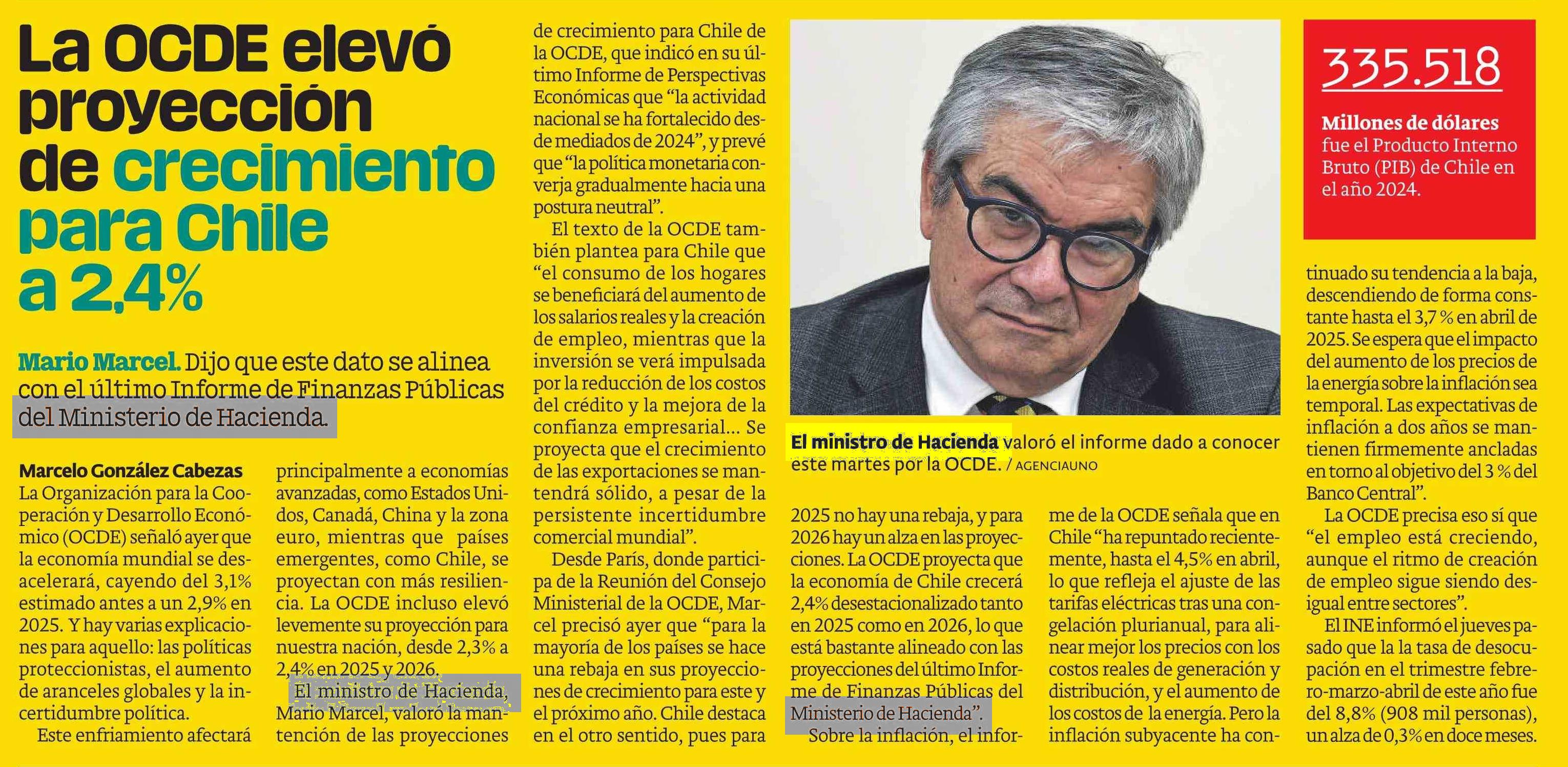 La OCDE elevó proyección de crecimiento para Chile a 2,4%