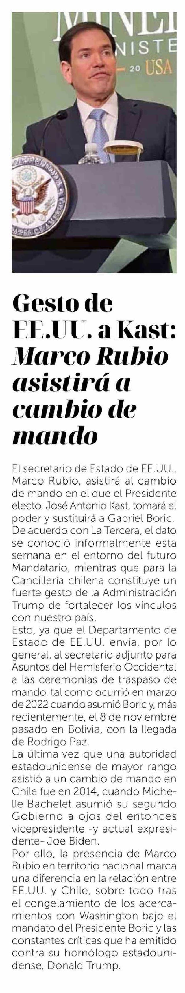 Gesto de EE.UU. a Kast: Marco Rubio asistirá a cambio de mando
