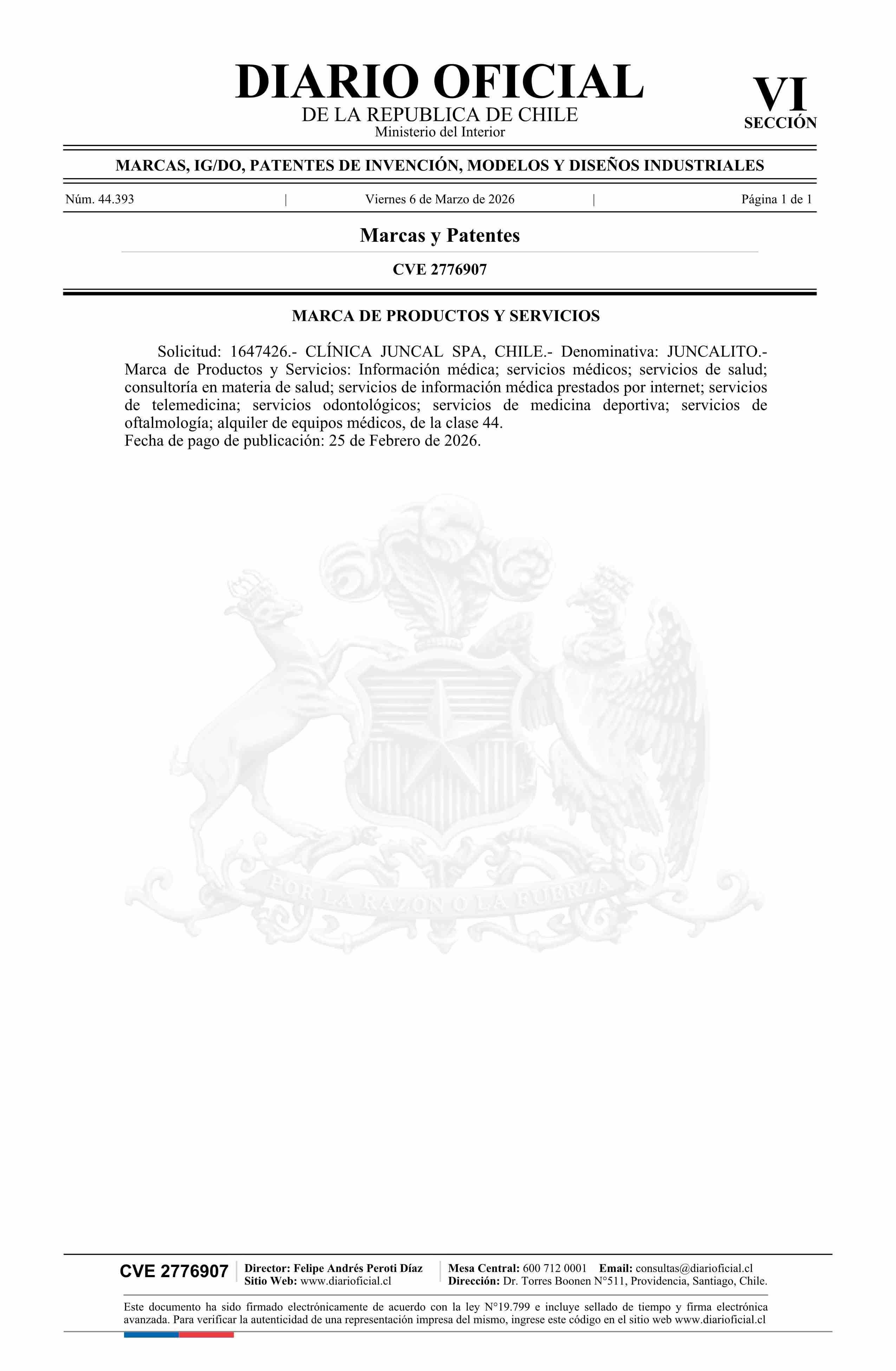Diario Oficial Edición Electrónica (Diario Oficial de Chile - 6 Marcas Y Patentes)