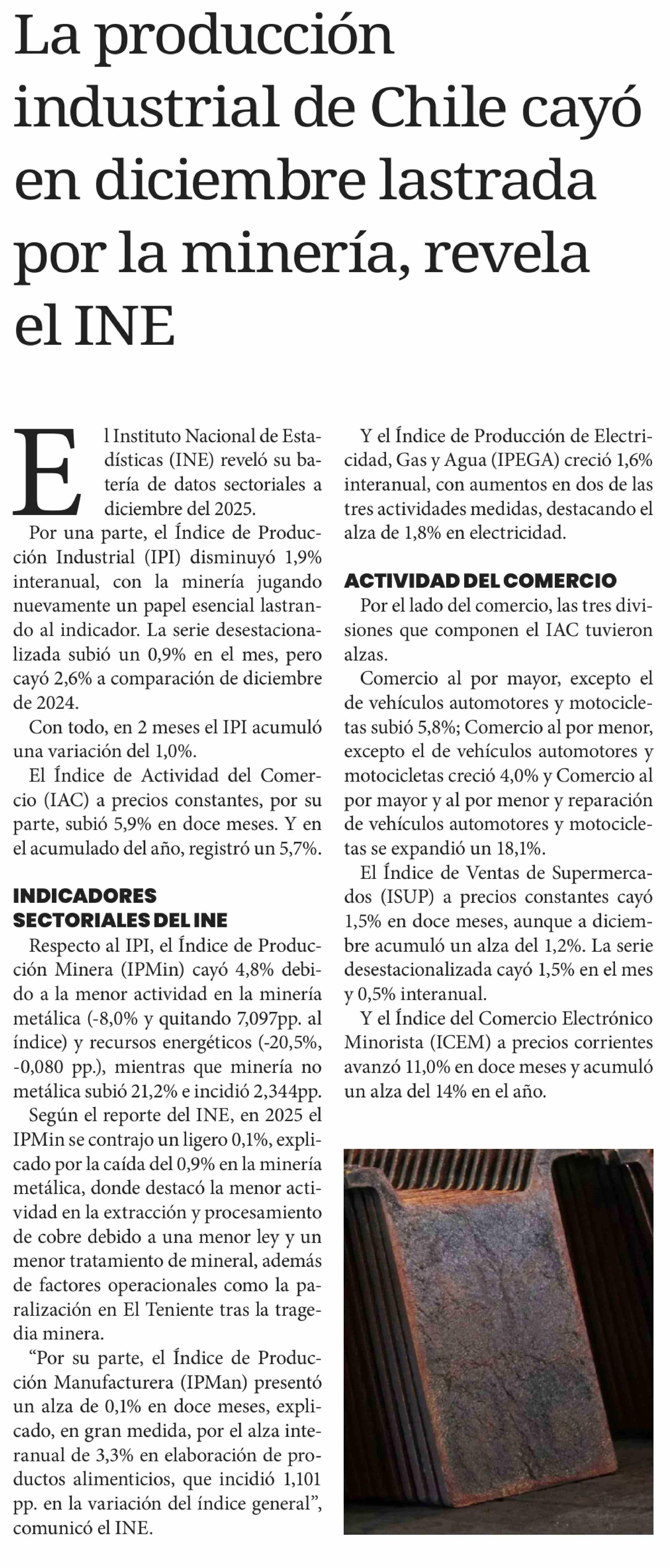 La producción industrial de Chile cayó en diciembre lastrada por la minería, revela el INE