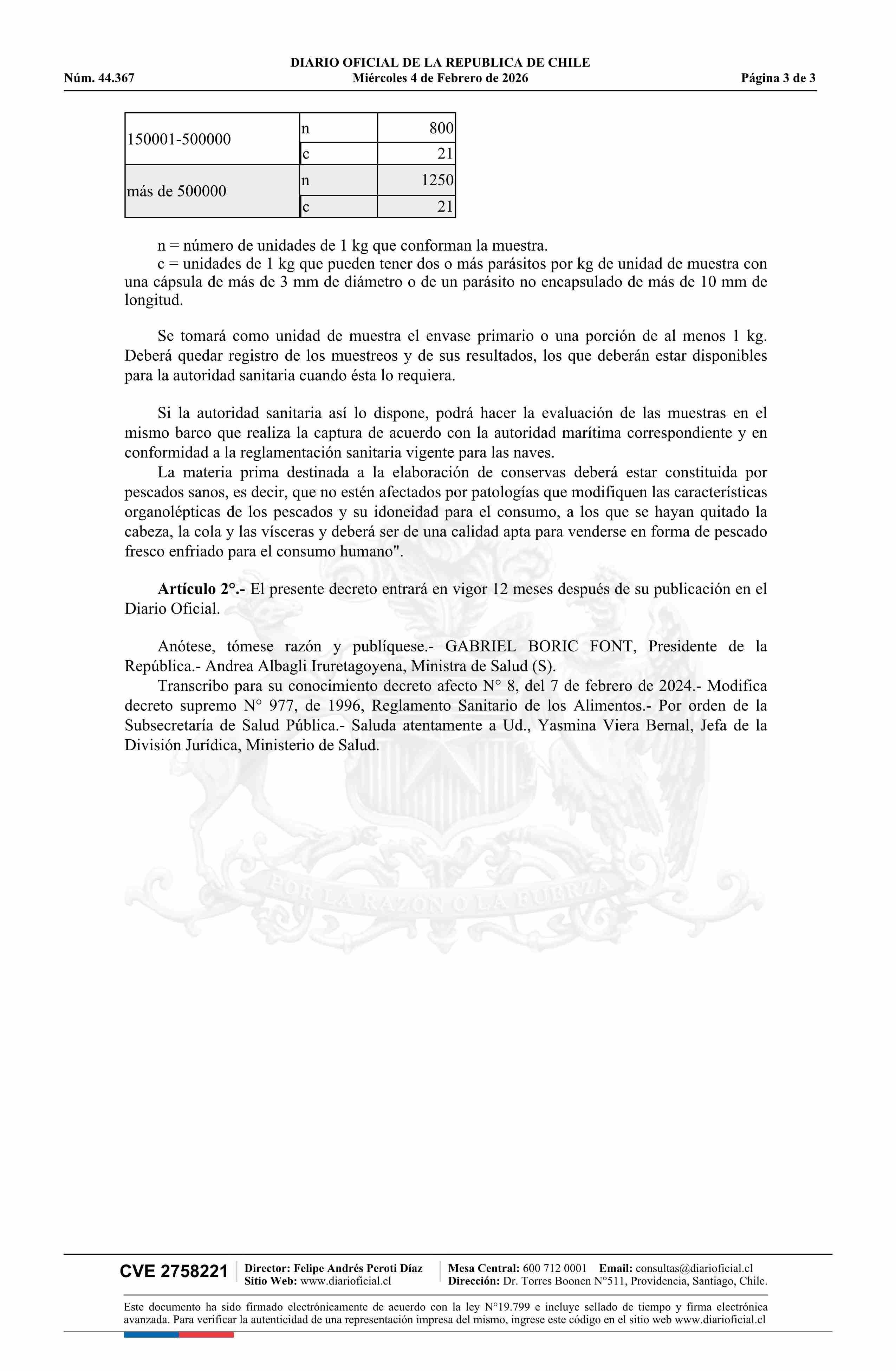 | Título: | Decreto número 8, de 2024.- Modifica decreto N° 77, de 1996, Reglamento Sanitario de los Alimentos |