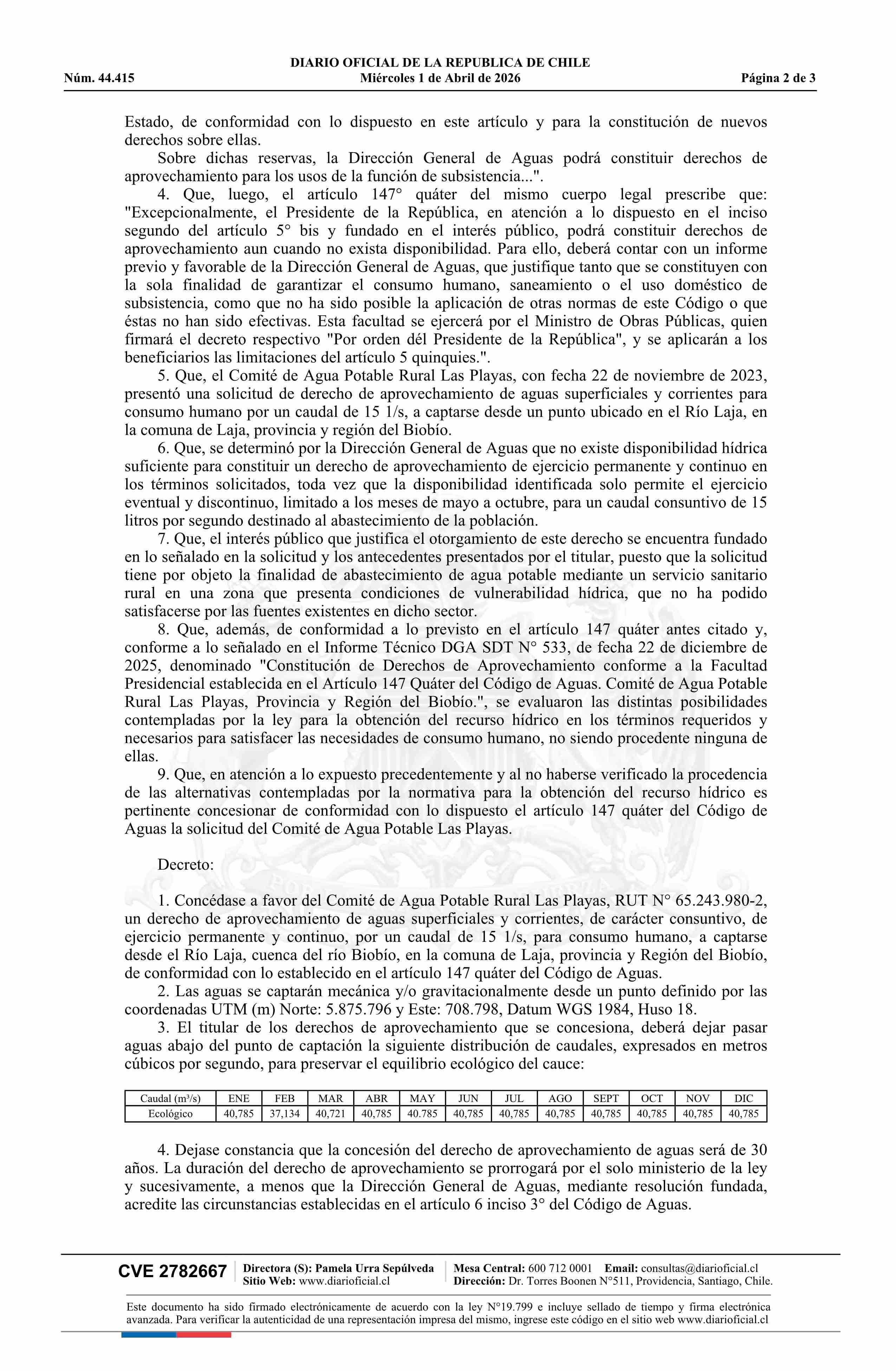 Título: Decreto número 7, de 2026.- Concede derecho de aprovechamiento consuntivo de aguas superficiales y corrientes a favor del Comité de Agua Potable Rural Las Playas, de conformidad con lo dispuesto en el artículo 147 Quáter del Código de Aguas, provincia y Región del Biobío