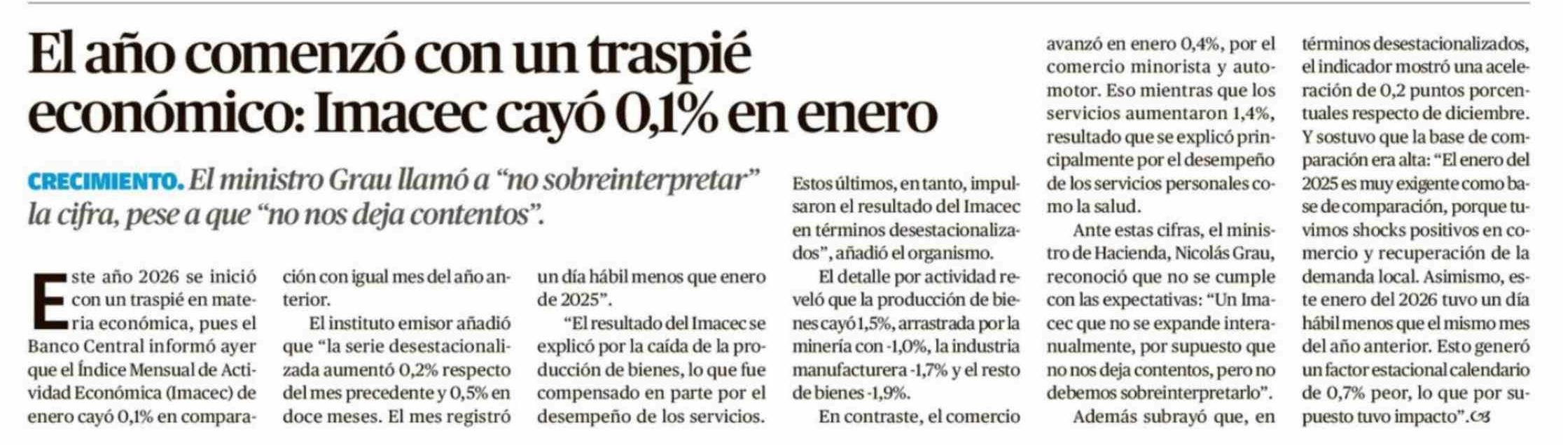 El año comenzó con un traspié económico: Imacec cayó 0,1% en enero