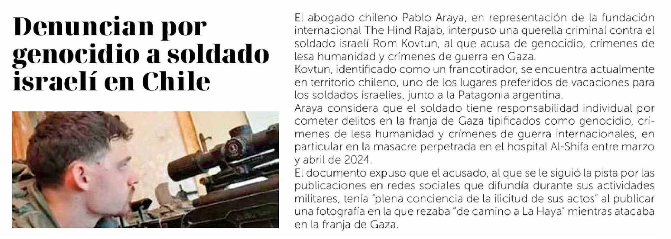 Denuncian por genocidio a soldado israelí en Chile