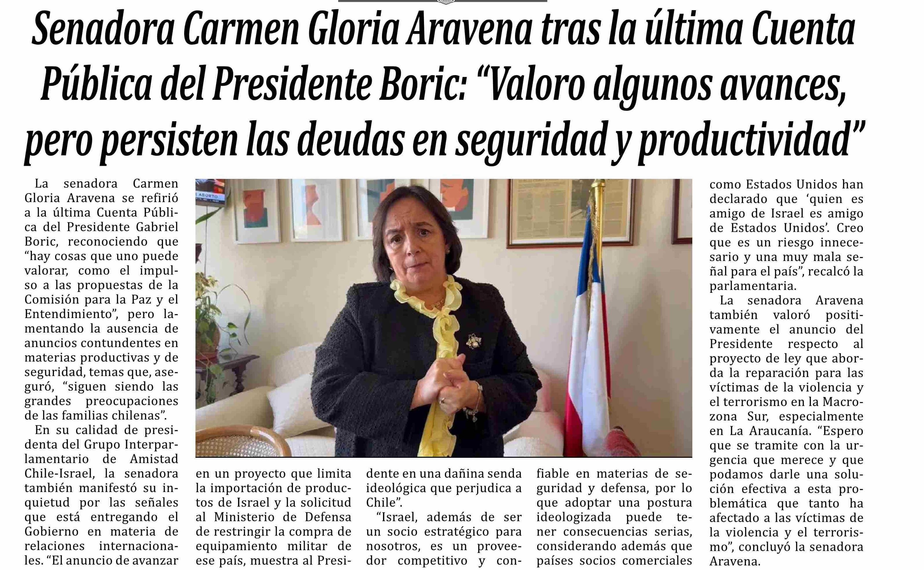 | Título: | Senadora Carmen Gloria Aravena tras la última Cuenta Pública del Presidente Boric: “Valoro algunos avances, pero persisten las deudas en seguridad y productividad” |