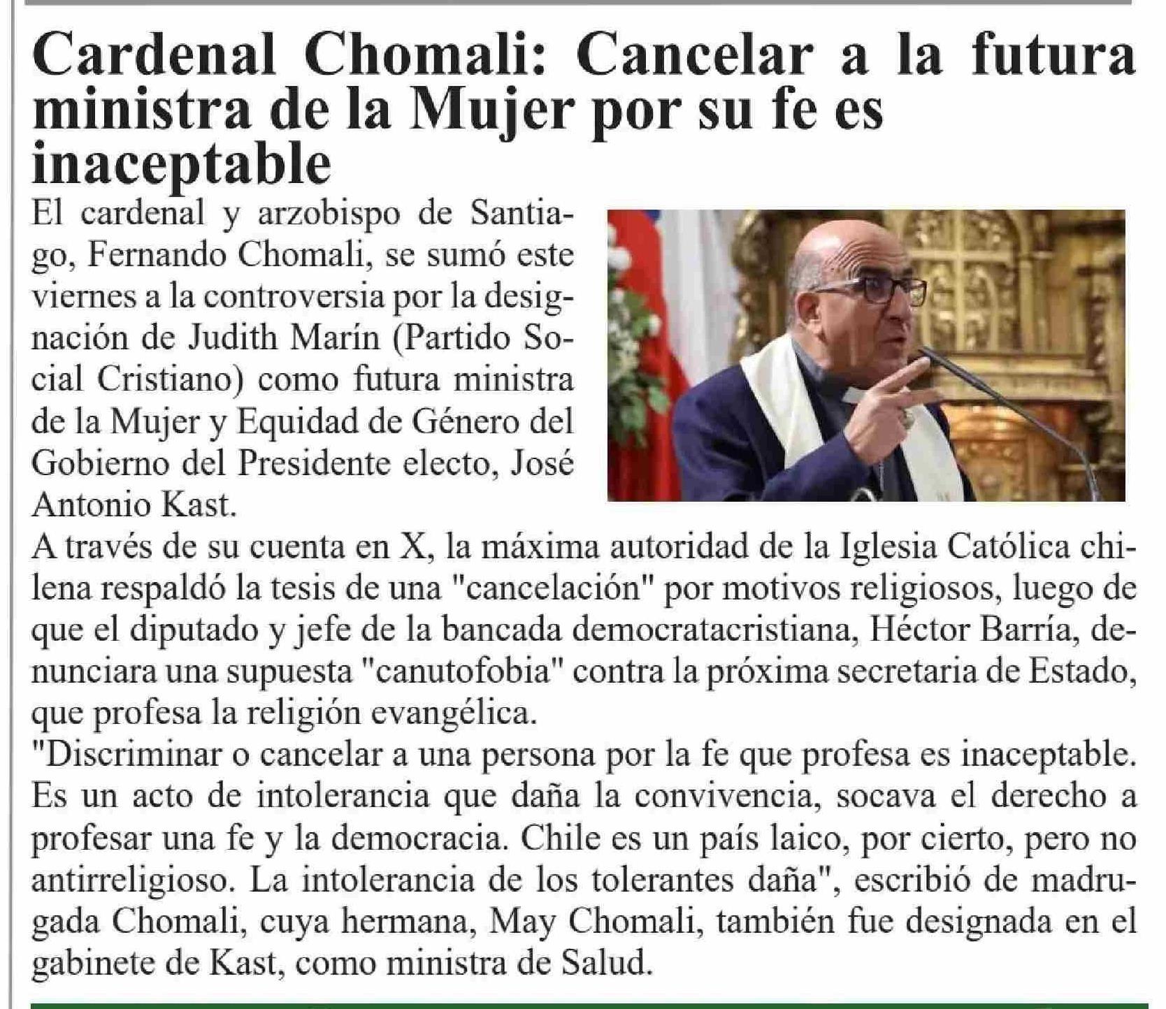 Cardenal Chomali: Cancelar a la futura ministra de la Mujer por su fe es inaceptable