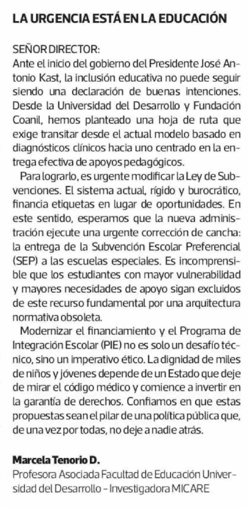 Cartas: LA URGENCIA ESTÁ EN LA EDUCACIÓN