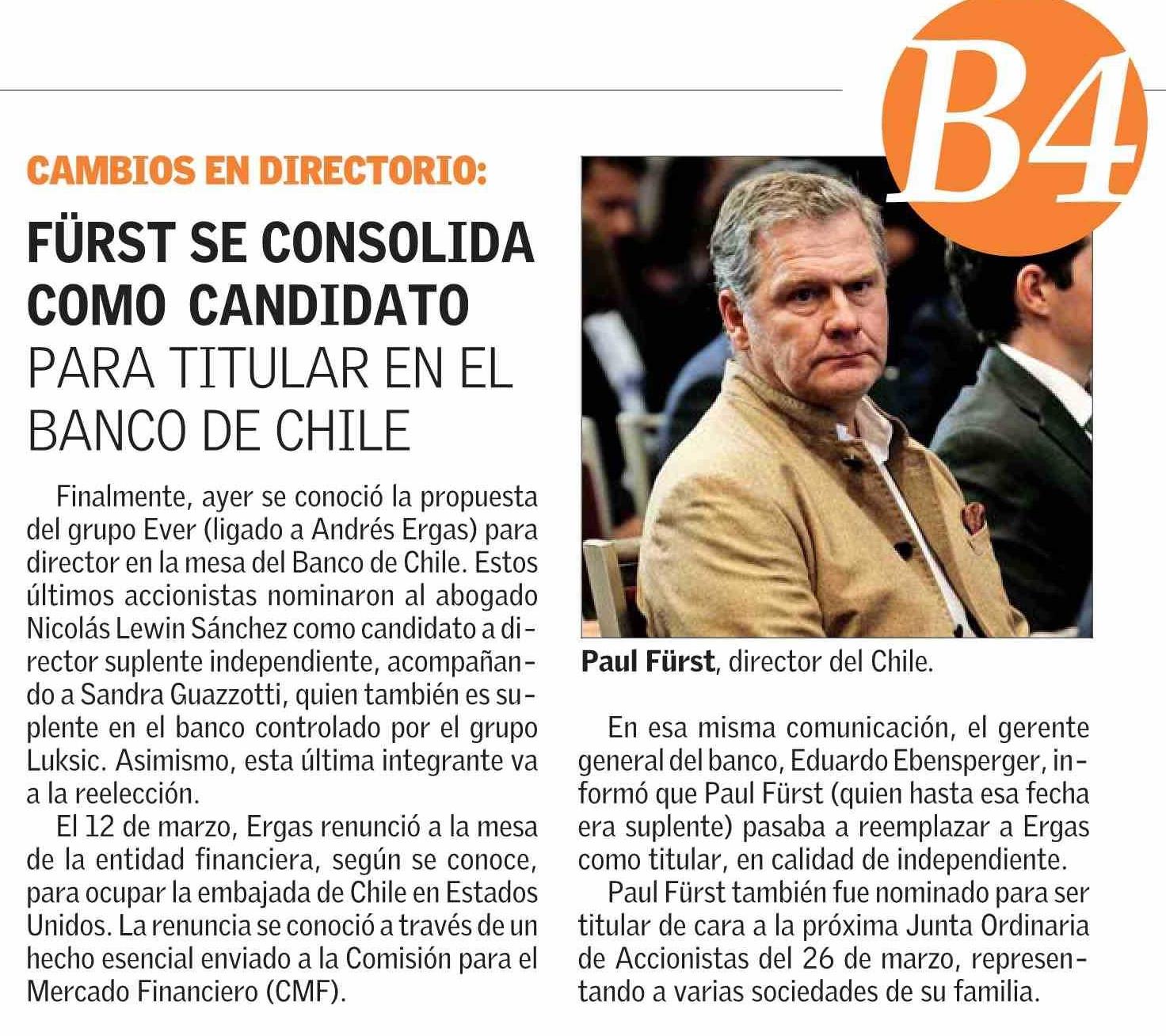 FÜRST SE CONSOLIDA COMO CANDIDATO PARA TITULAR EN EL BANCO DE CHILE