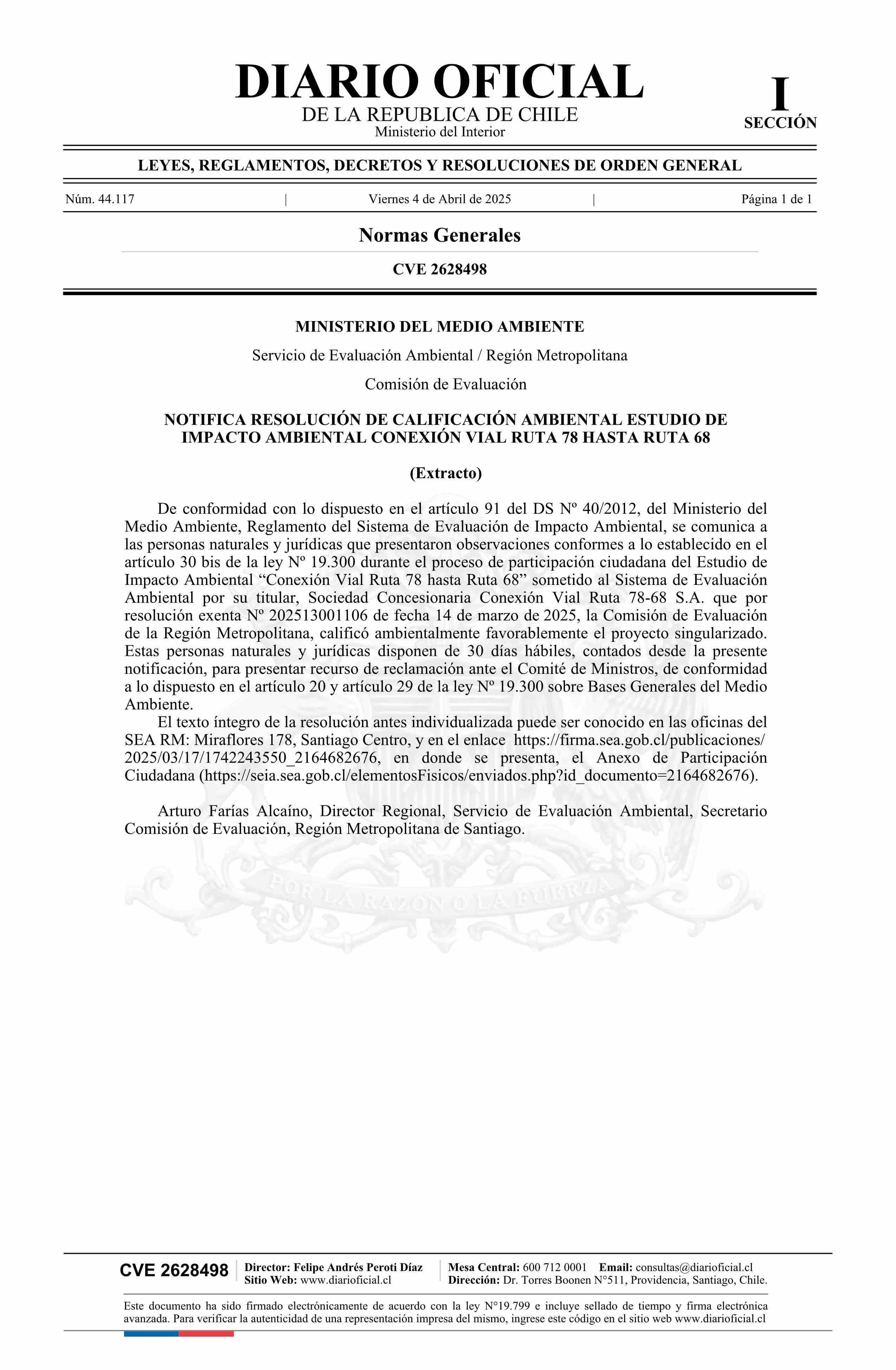 | Título: | Extracto de resolución exenta número 202513001106, de 2025.- Notifica Resolución de Calificación Ambiental del Estudio de Impacto Ambiental Conexión Vial Ruta 78 hasta Ruta 68 |