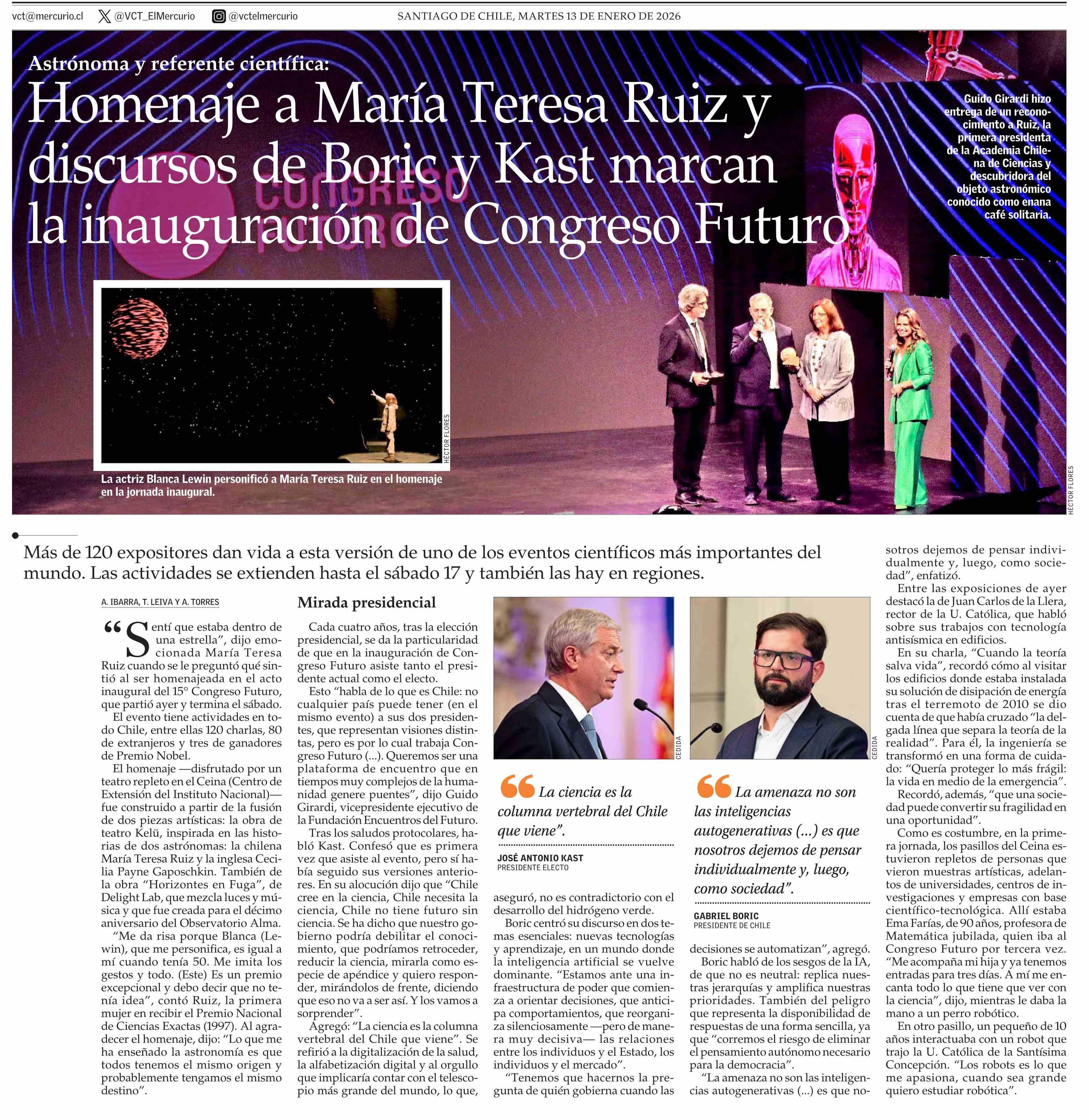 Homenaje a María Teresa Ruiz y discursos de Boric y Kast marcan la inauguración de Congreso Futuro