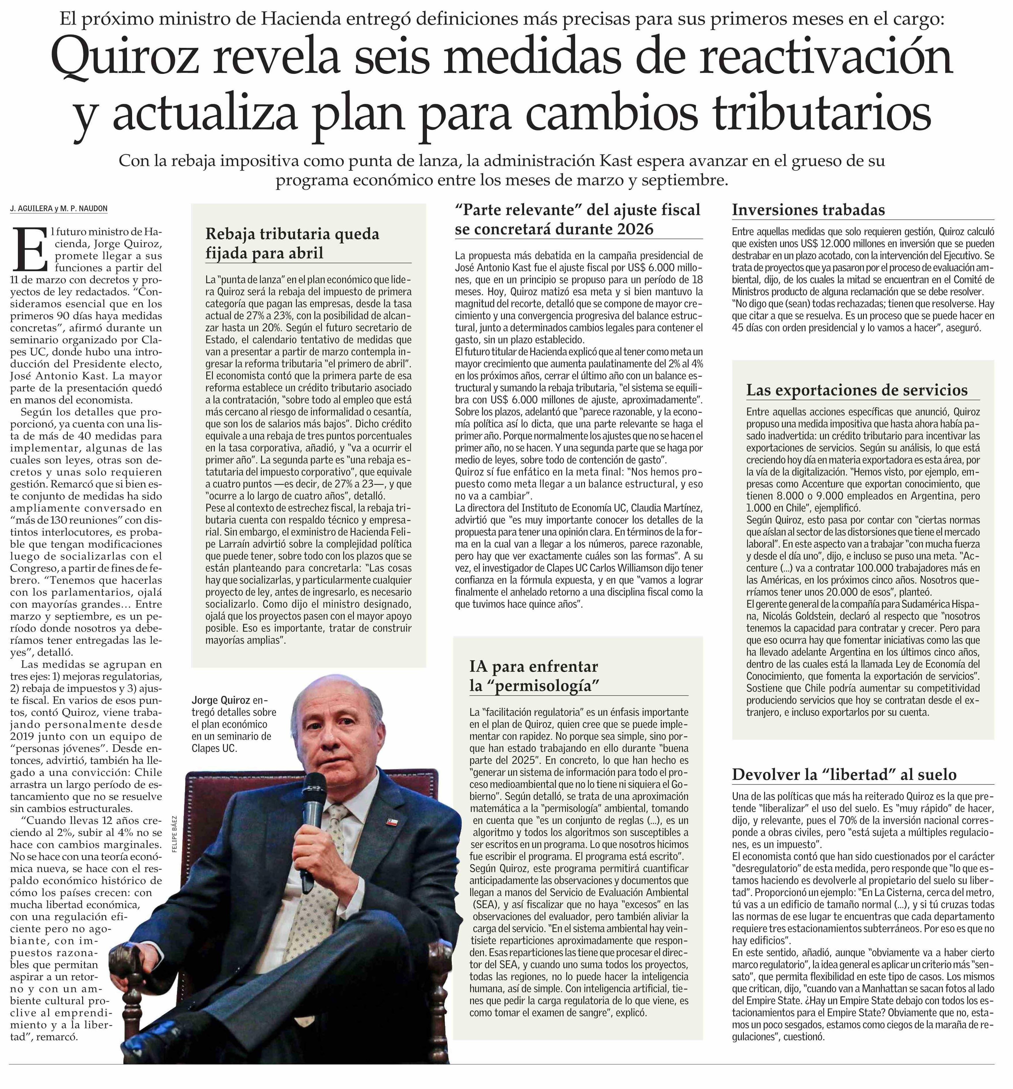 Quiroz revela seis medidas de reactivación y actualiza plan para cambios tributarios