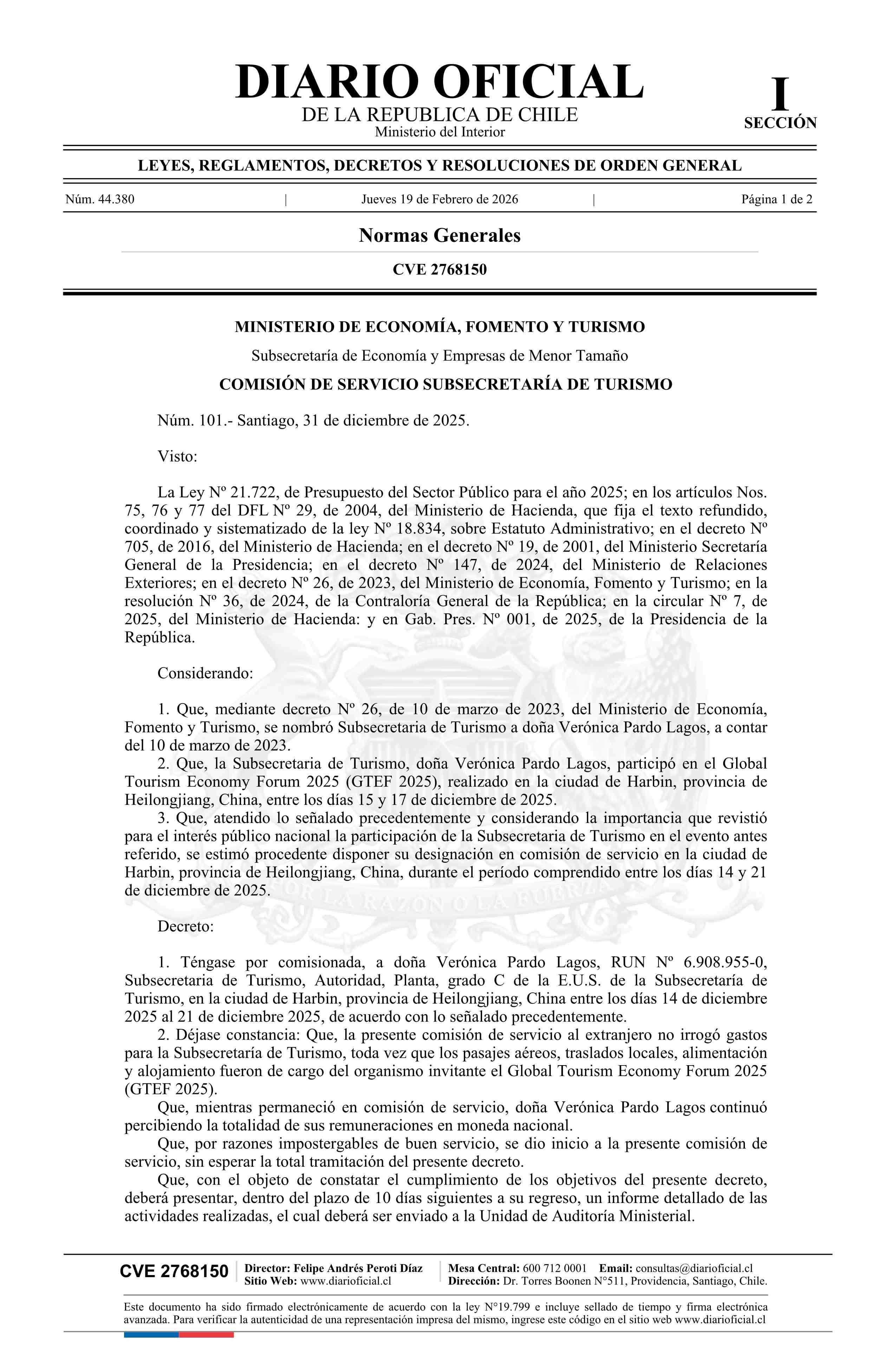 | Título: | Decreto número 101, de 2025.- Designa en comisión de servicio a doña Verónica Pardo Lagos, Subsecretaria de Turismo, a la ciudad de Harbin, China |
