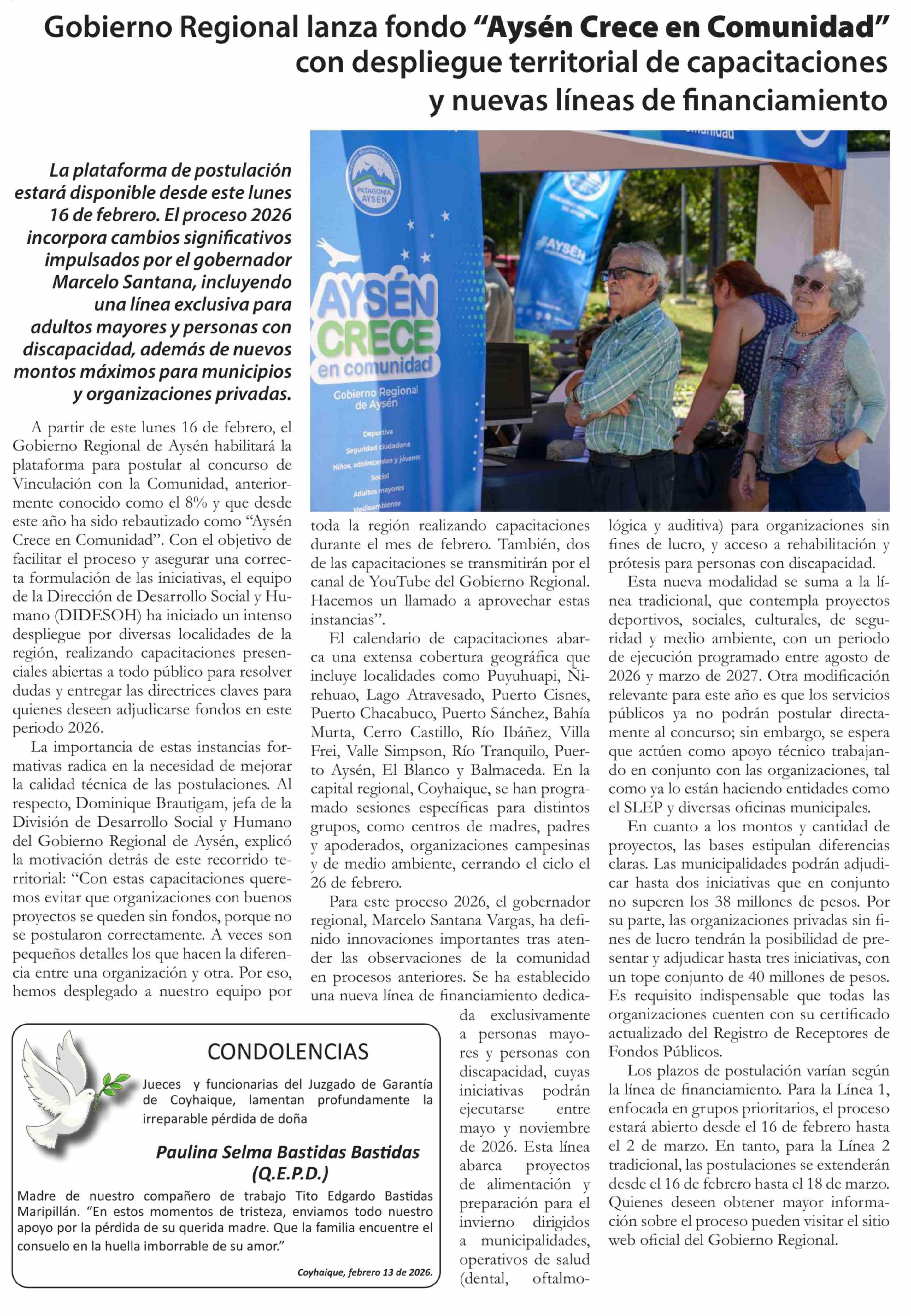 | Fecha: | 13-02-2026 | Sector: | Noticia general | Región: | Región Aysén del General Carlos Ibáñez del Campo |