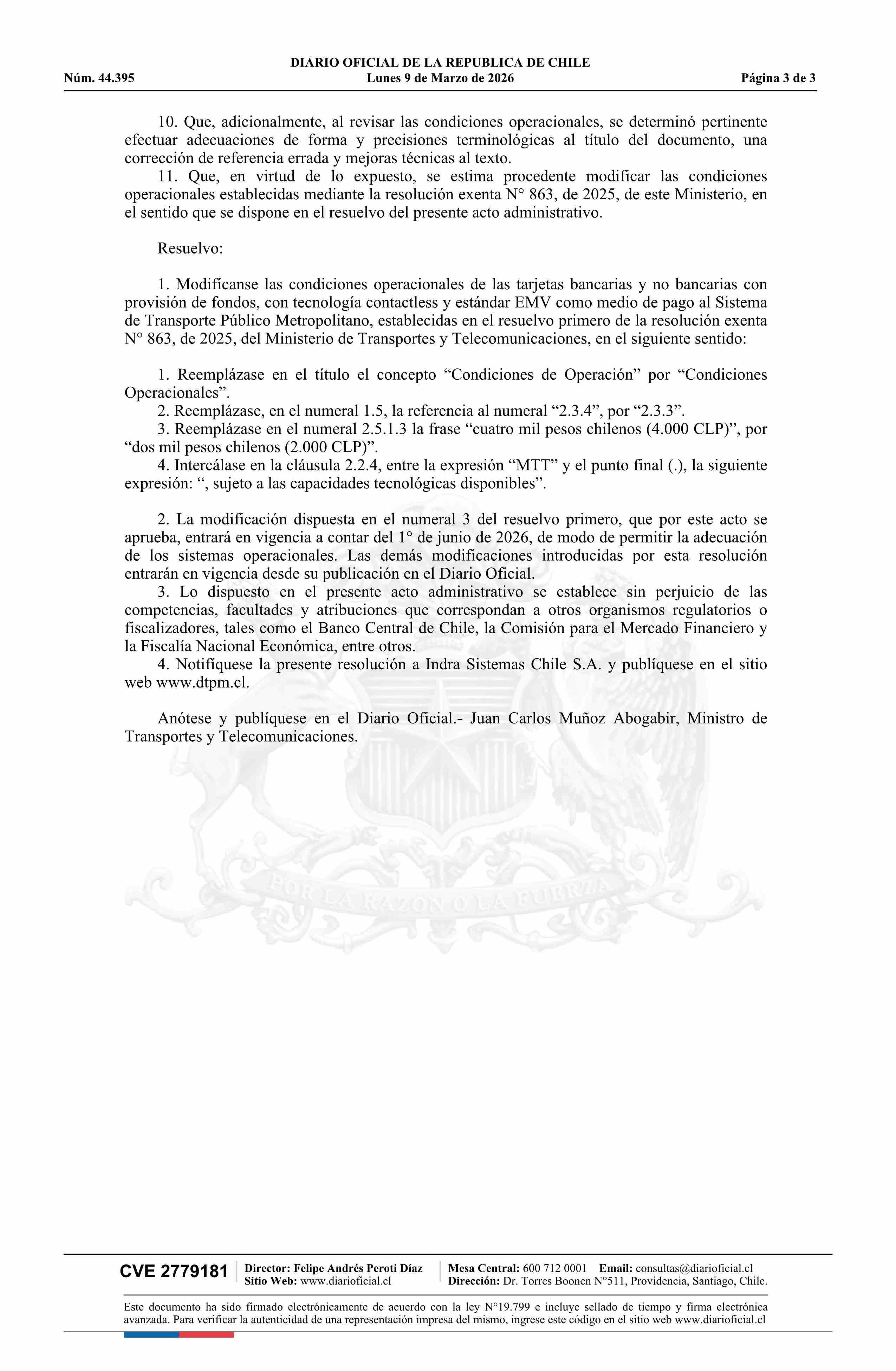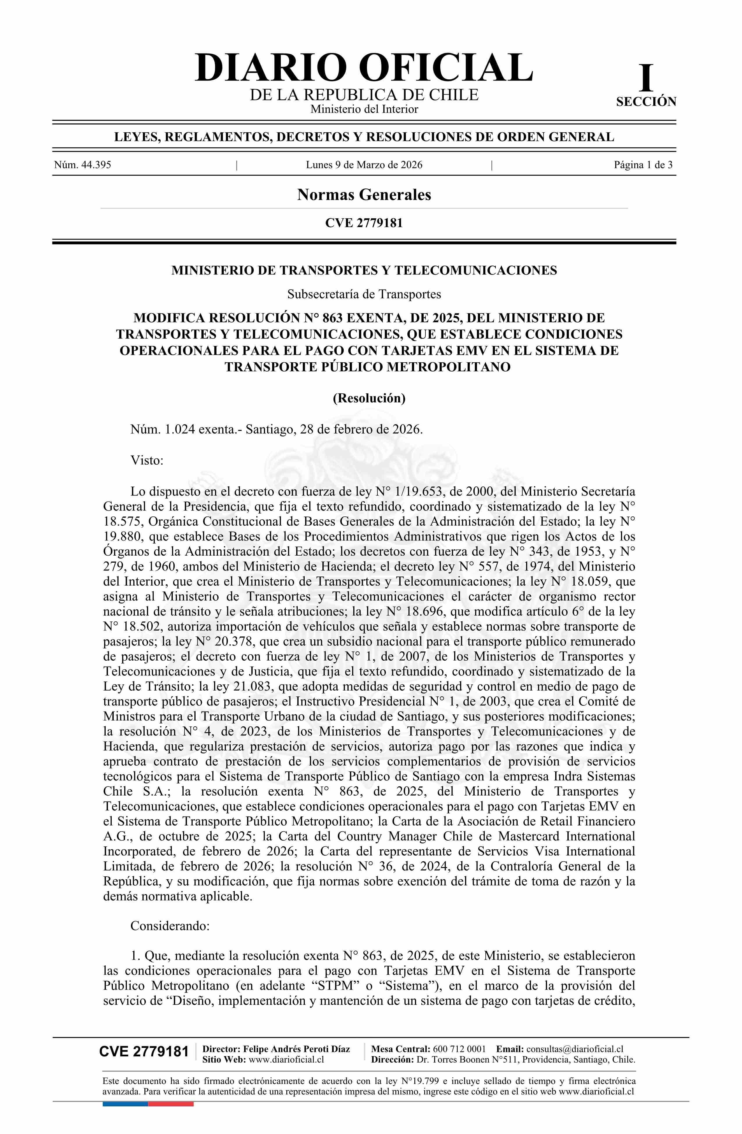 | Título: | Resolución exenta número 1.024, de 2026.- Modifica resolución N° 863 exenta, de 2025, que establece condiciones operacionales para el pago con Tarjetas EMV en el Sistema de Transporte Público Metropolitano |