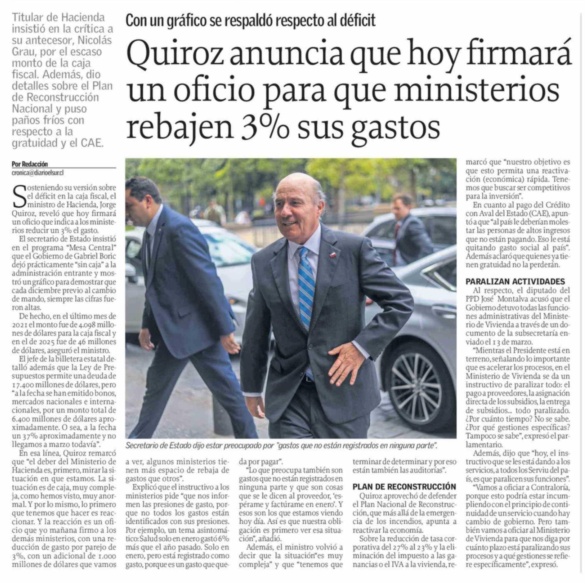 Quiroz anuncia que hoy firmará un oficio para que ministerios rebajen 3% sus gastos